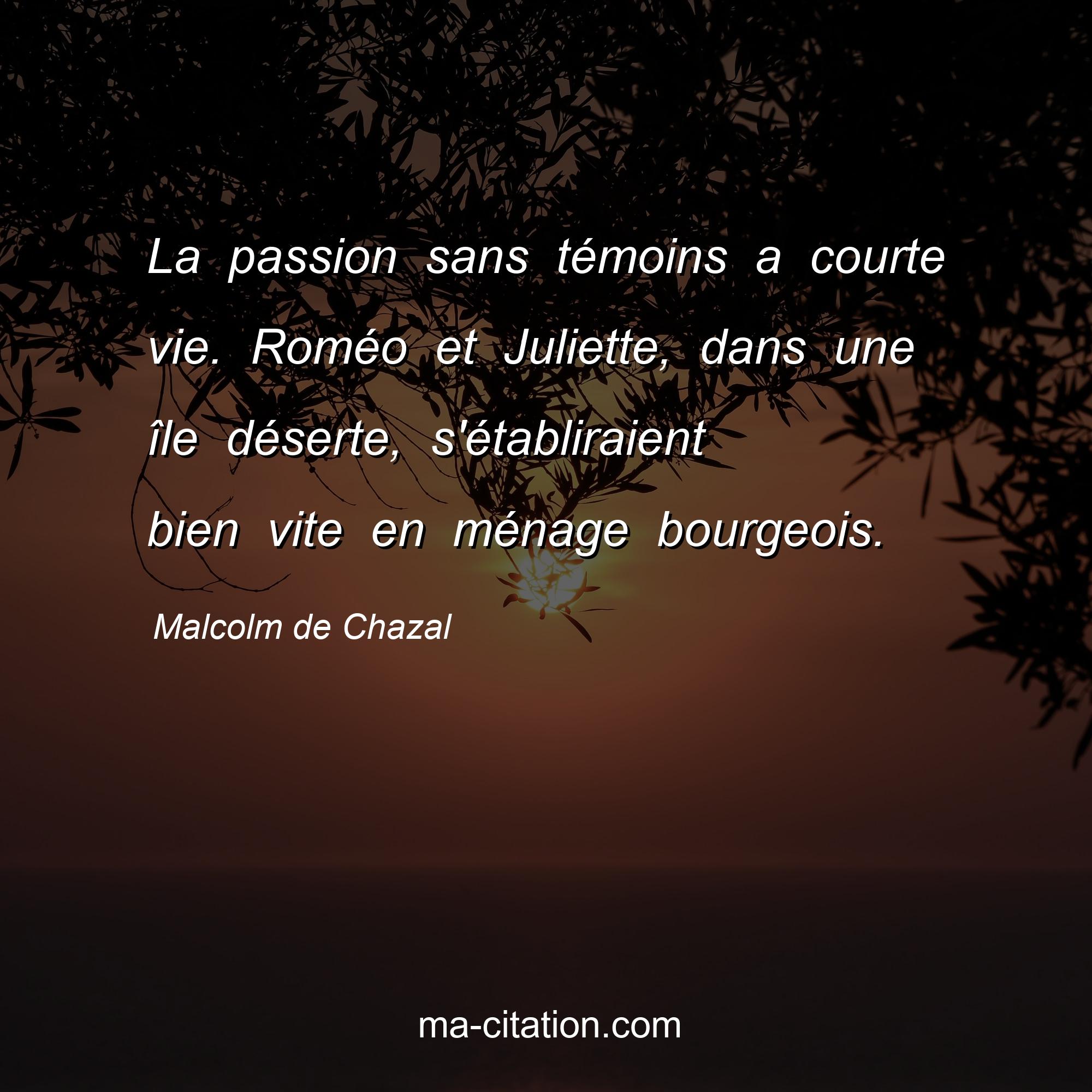 Citation sur la vie de Malcolm de Chazal :La passion sans témoins a courte vie. Roméo et Juliette, dans une île déserte, s'établiraient bien vite en ménage bourgeois.