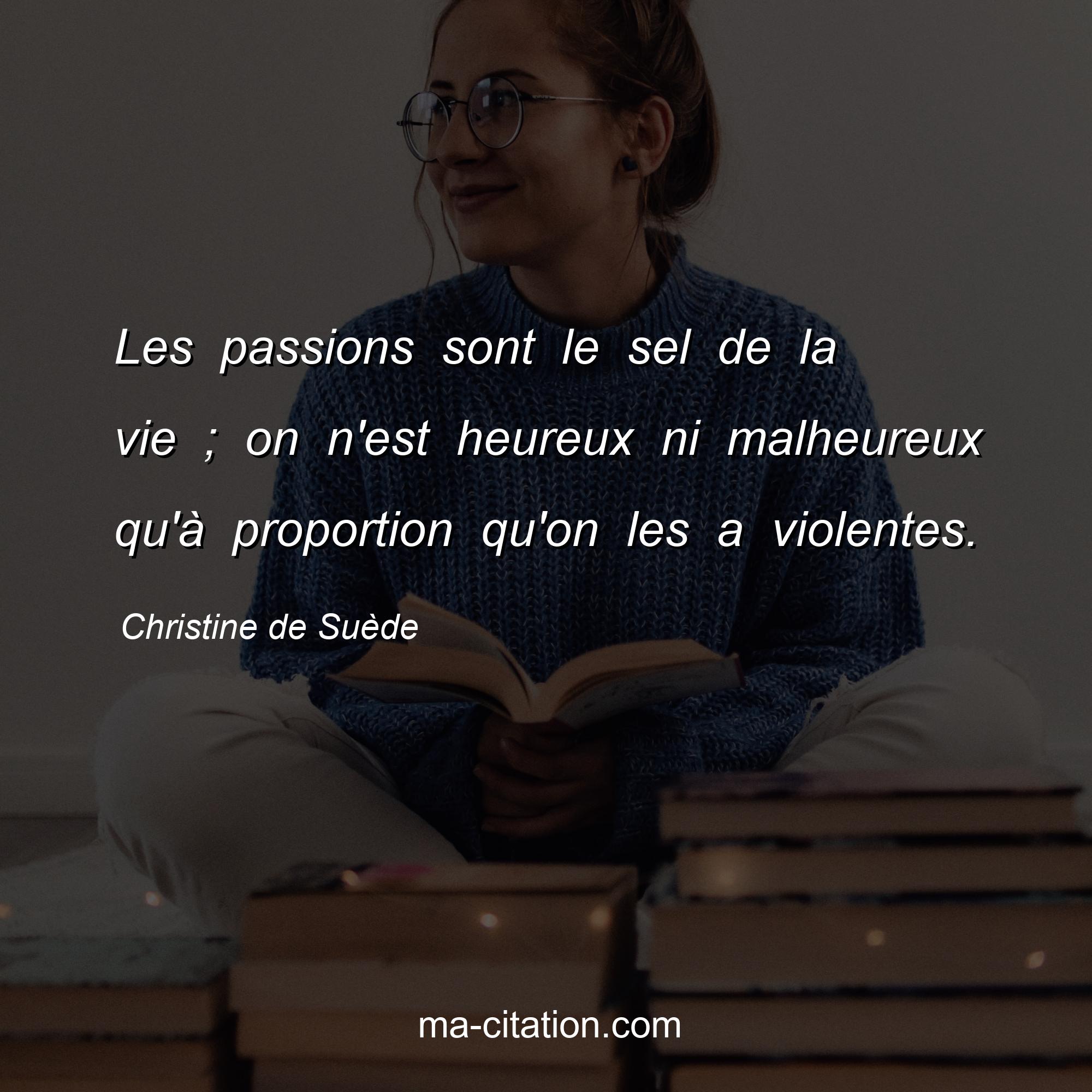 Christine de Suède est l'auteur de la citation sur la vie "Les passions sont le sel de la vie ; on n'est heureux ni malheureux qu'à proportion qu'on les a violentes.".