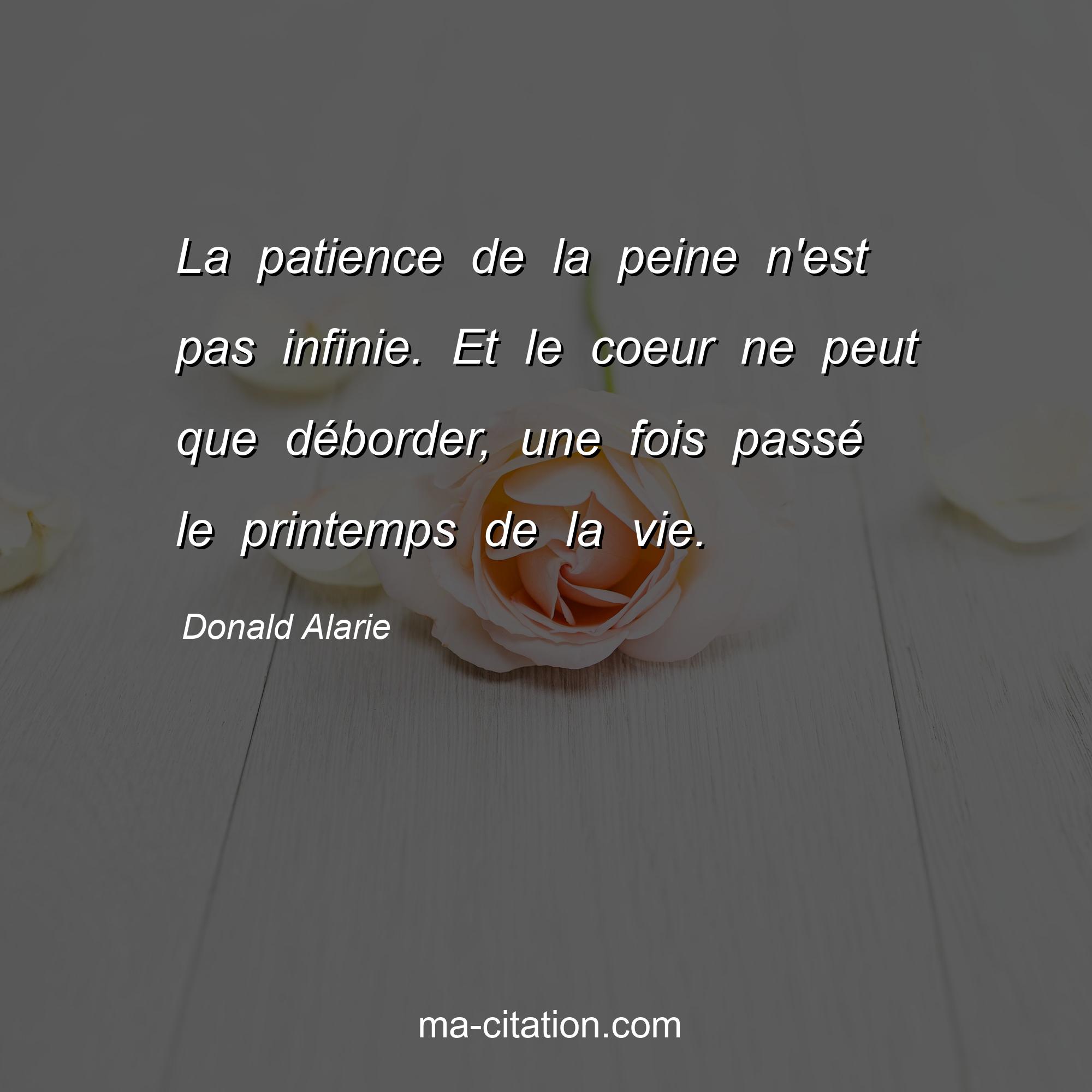 Donald Alarie est l'auteur de la citation sur la vie "La patience de la peine n'est pas infinie. Et le coeur ne peut que déborder, une fois passé le printemps de la vie.".