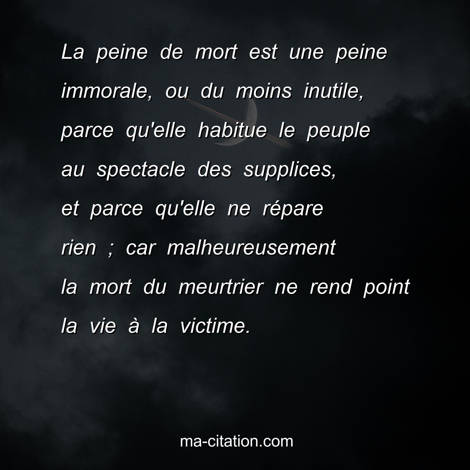 La peine de mort est une peine immorale, ou du moins inutile, parce qu'elle habitue le peuple au spectacle des supplices, et parce qu'elle ne répare rien ; car malheureusement la mort du meurtrier ne rend point la vie à la victime.