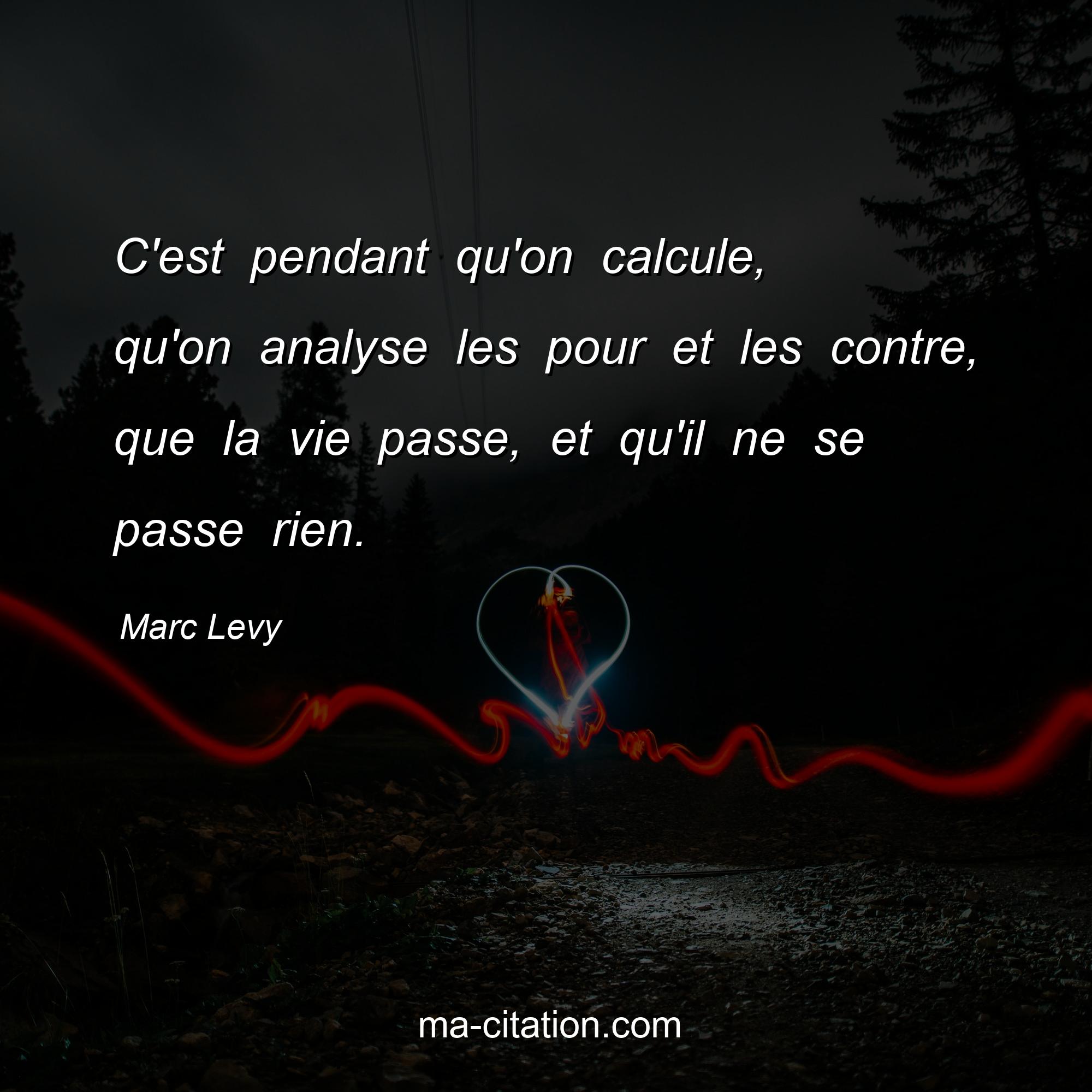 Citation sur la vie de Marc Levy :C'est pendant qu'on calcule, qu'on analyse les pour et les contre, que la vie passe, et qu'il ne se passe rien.
