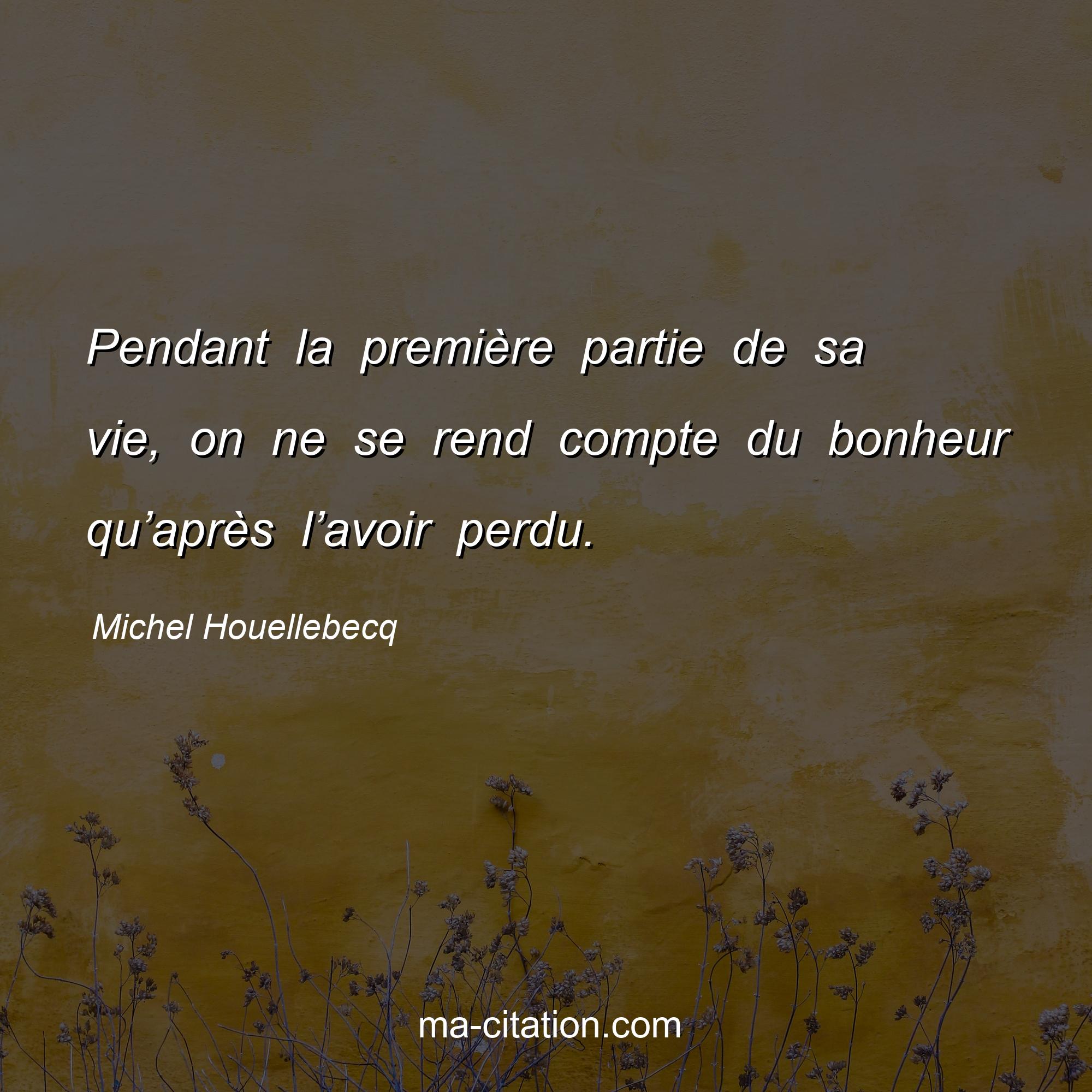 Citation sur la vie de Michel Houellebecq :Pendant la première partie de sa vie, on ne se rend compte du bonheur qu’après l’avoir perdu.
