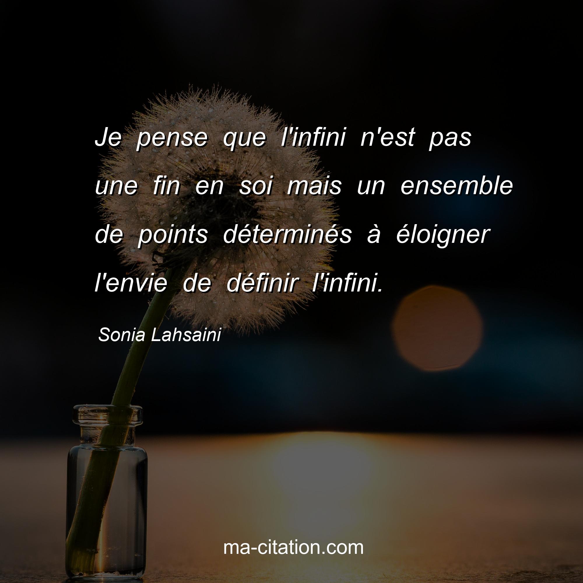 Sonia Lahsaini est l'auteur de la citation sur la vie "Je pense que l'infini n'est pas une fin en soi mais un ensemble de points déterminés à éloigner l'envie de définir l'infini.".