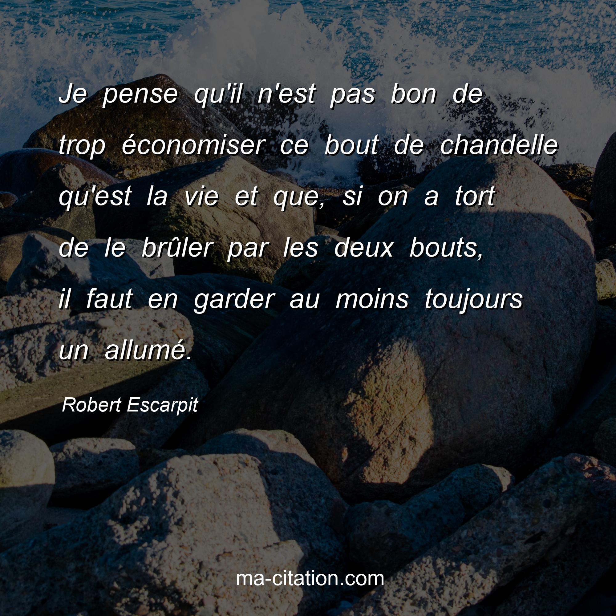 Citation sur la vie de Robert Escarpit :Je pense qu'il n'est pas bon de trop économiser ce bout de chandelle qu'est la vie et que, si on a tort de le brûler par les deux bouts, il faut en garder au moins toujours un allumé.