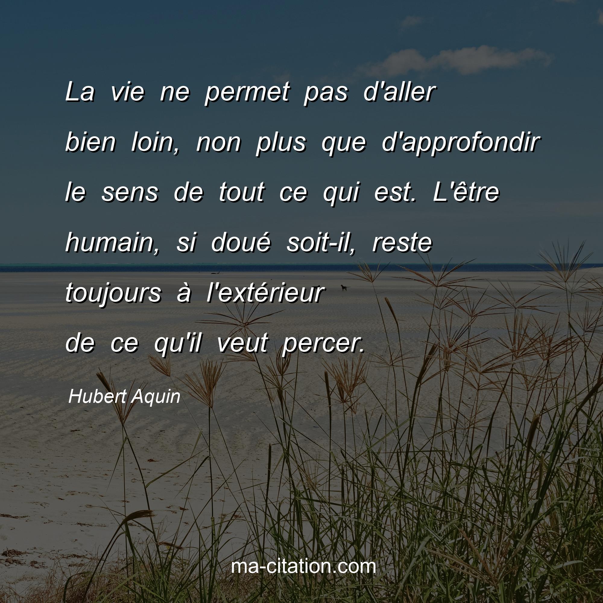 Citation sur la vie de Hubert Aquin :La vie ne permet pas d'aller bien loin, non plus que d'approfondir le sens de tout ce qui est. L'être humain, si doué soit-il, reste toujours à l'extérieur de ce qu'il veut percer.