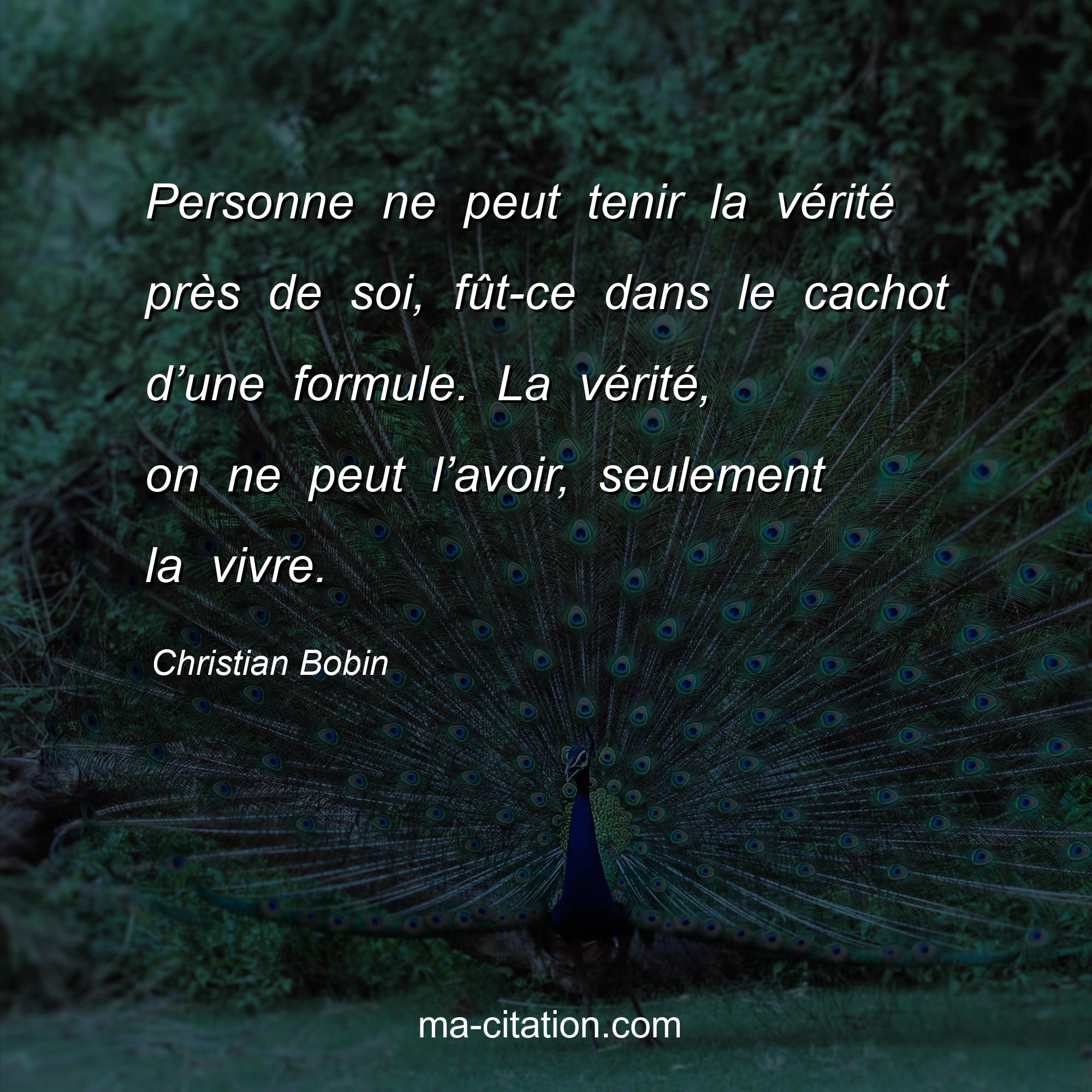 Citation sur la vie de Christian Bobin :Personne ne peut tenir la vérité près de soi, fût-ce dans le cachot d’une formule. La vérité, on ne peut l’avoir, seulement la vivre.