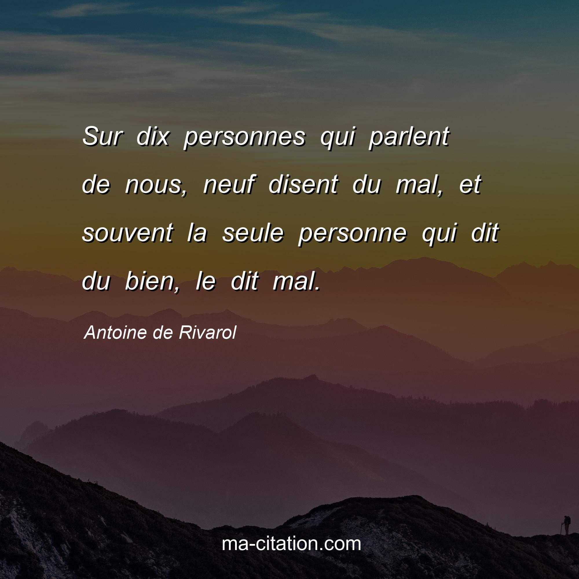 Citation sur la vie d'Antoine de Rivarol :Sur dix personnes qui parlent de nous, neuf disent du mal, et souvent la seule personne qui dit du bien, le dit mal.