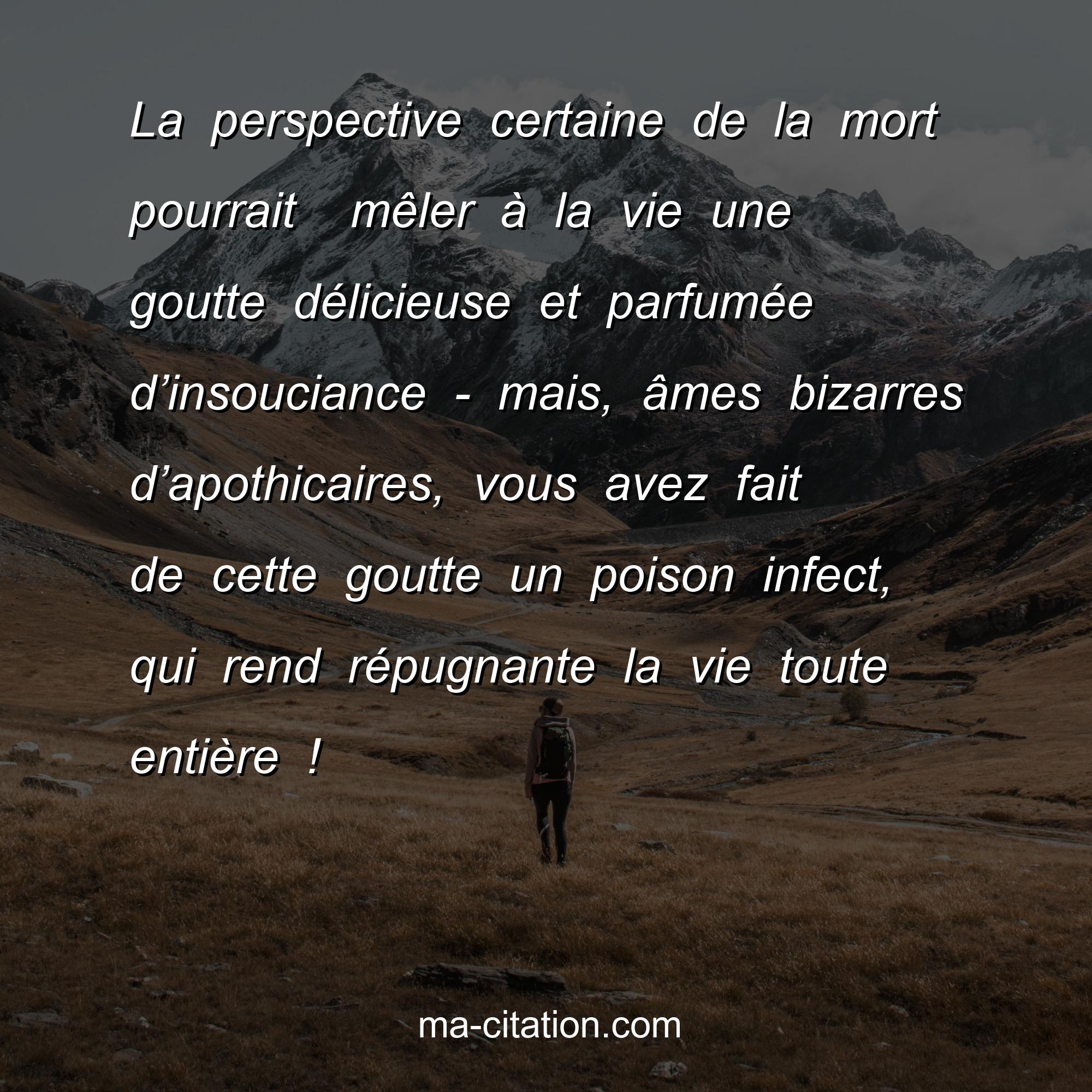 La perspective certaine de la mort pourrait mêler à la vie une goutte délicieuse et parfumée d’insouciance - mais, âmes bizarres d’apothicaires, vous avez fait de cette goutte un poison infect, qui rend répugnante la vie toute entière !