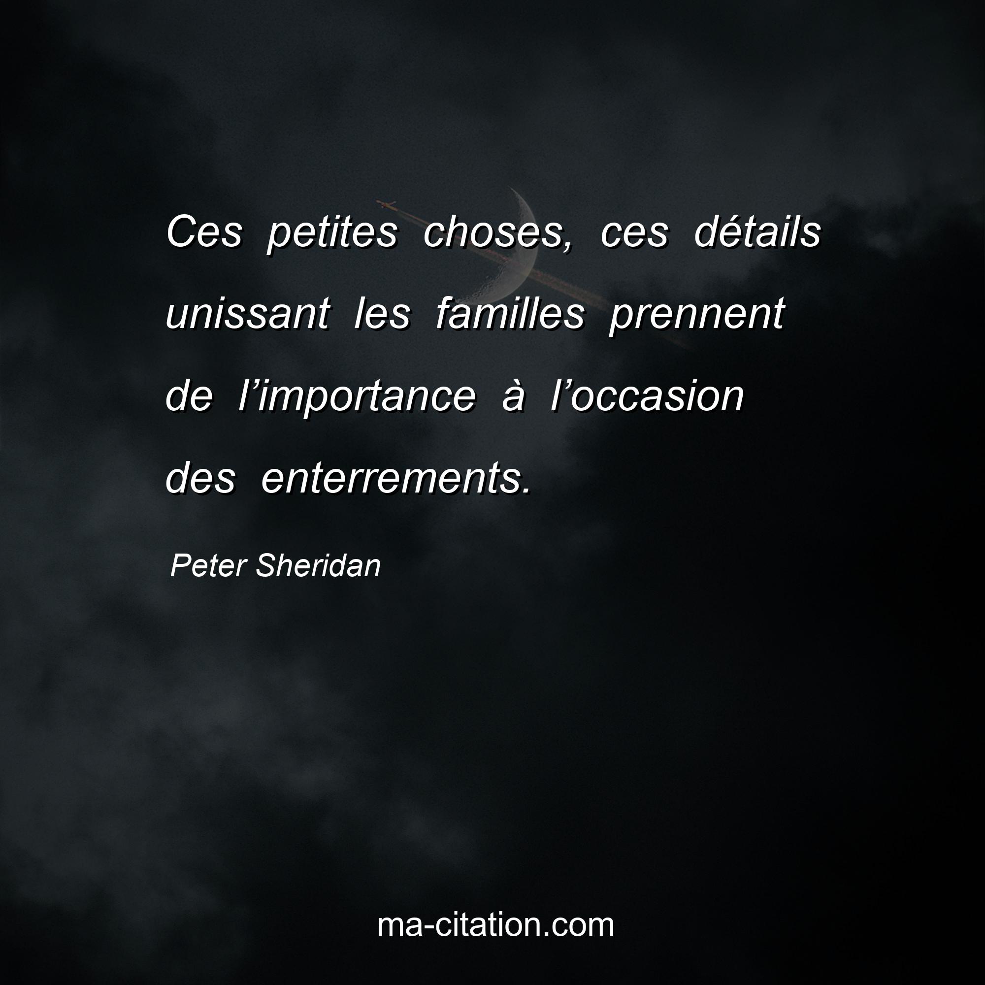 Citation sur la vie de Peter Sheridan :Ces petites choses, ces détails unissant les familles prennent de l’importance à l’occasion des enterrements.