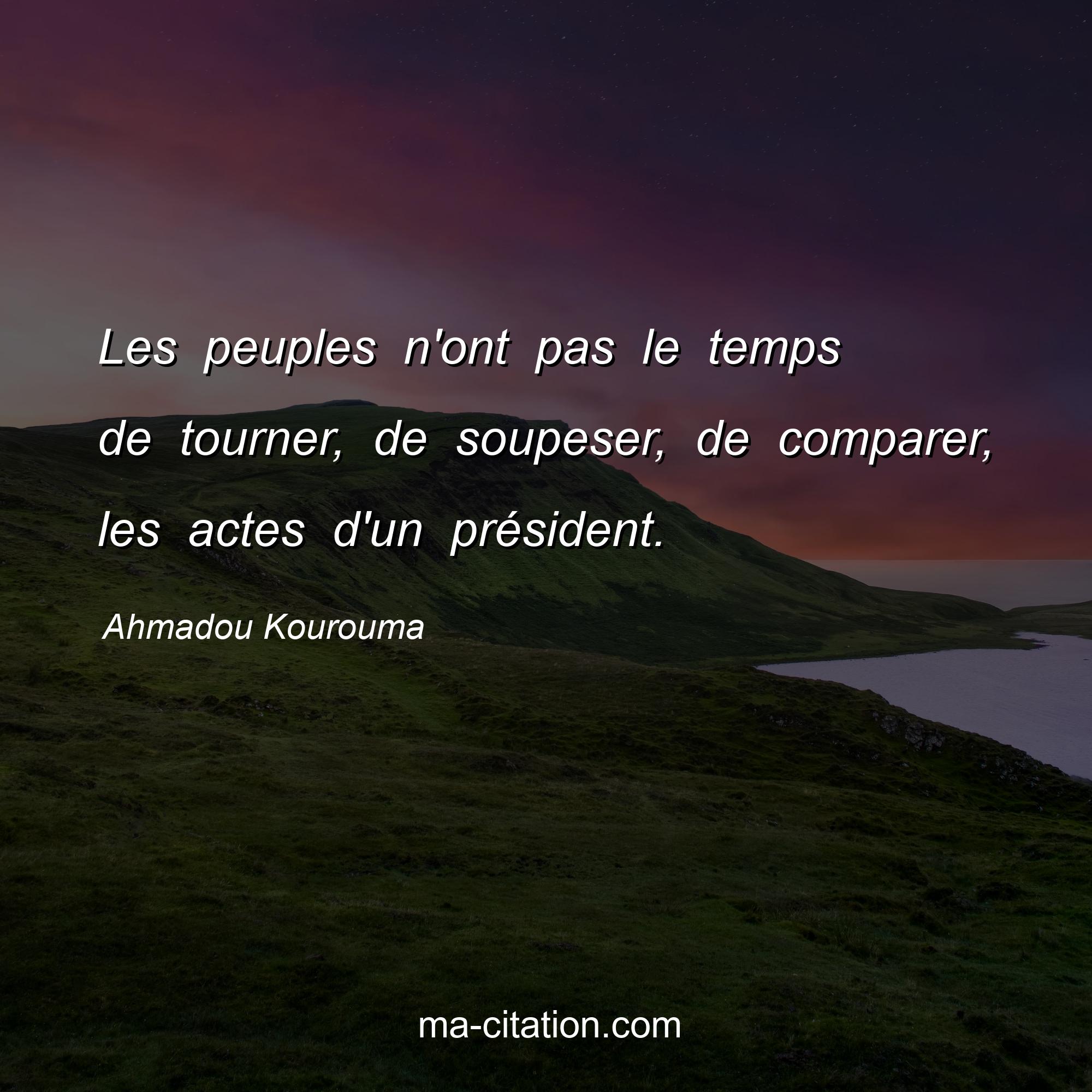 Citation sur la vie d'Ahmadou Kourouma :Les peuples n'ont pas le temps de tourner, de soupeser, de comparer, les actes d'un président.
