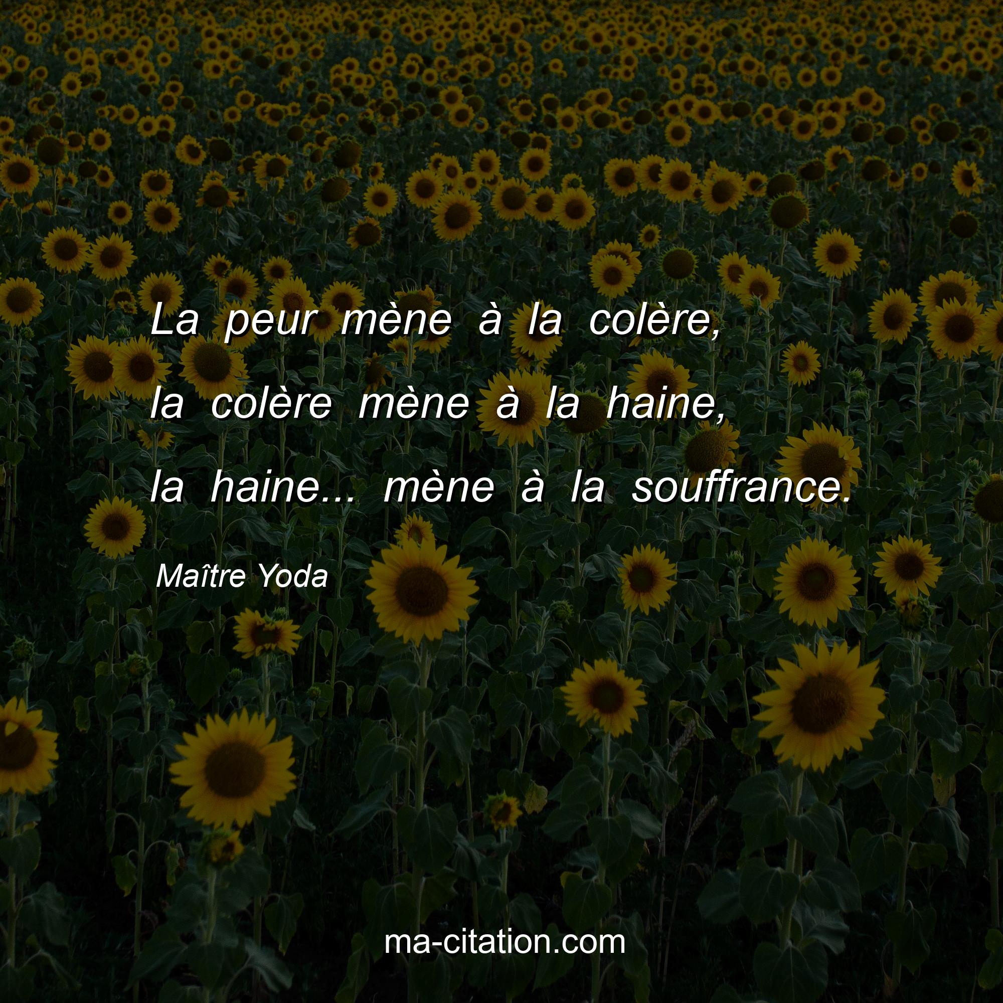 Citation sur la vie de Maître Yoda :La peur mène à la colère, la colère mène à la haine, la haine... mène à la souffrance.