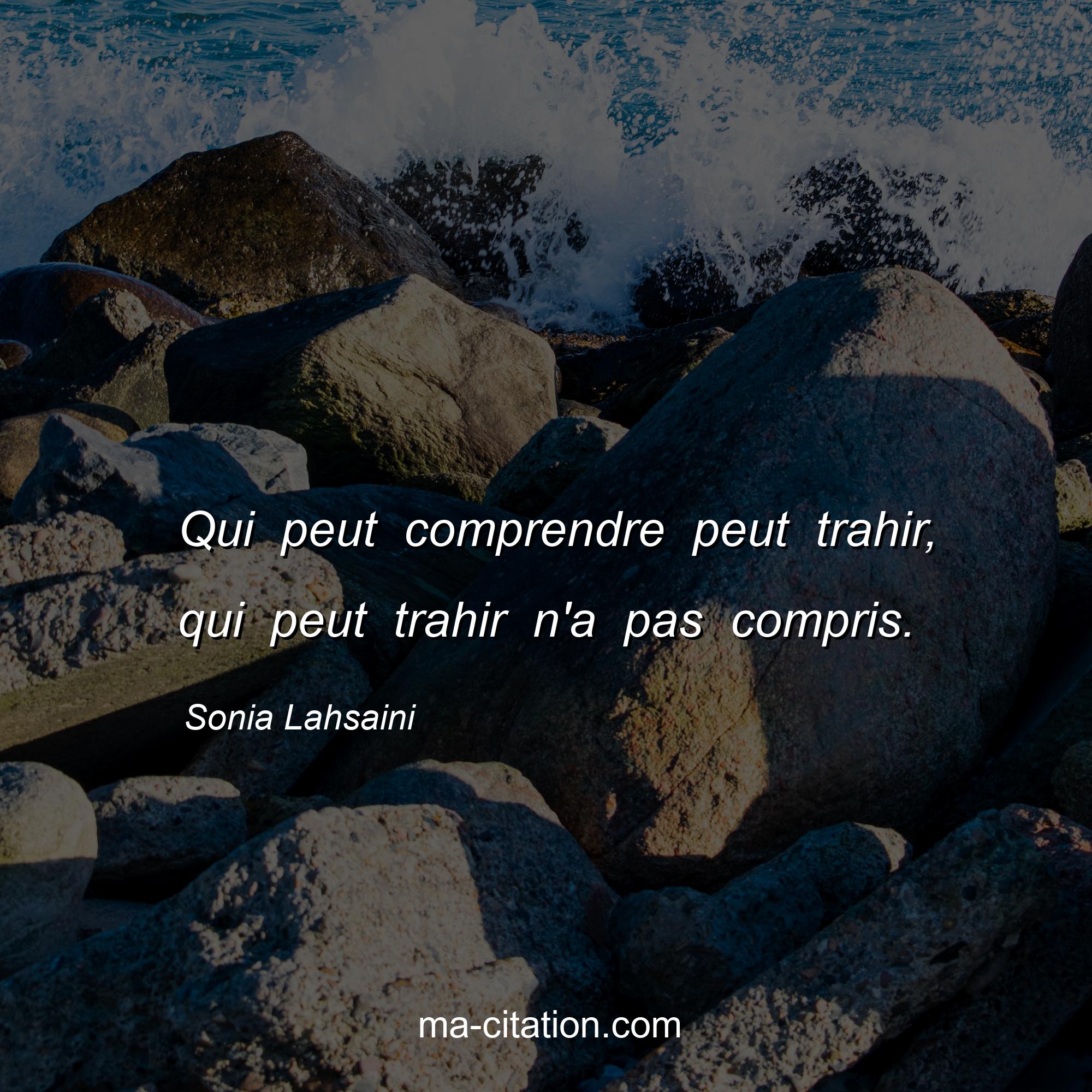 Sonia Lahsaini est l'auteur de la citation sur la vie "Qui peut comprendre peut trahir, qui peut trahir n'a pas compris.".