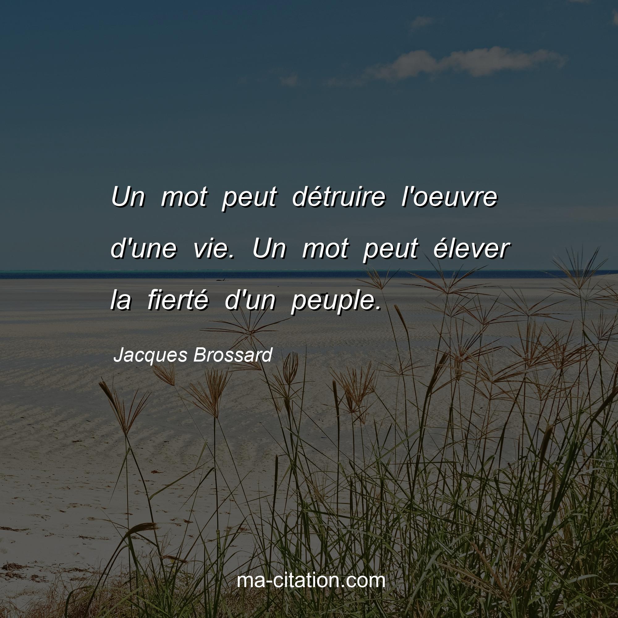 Jacques Brossard est l'auteur de la citation sur la vie "Un mot peut détruire l'oeuvre d'une vie. Un mot peut élever la fierté d'un peuple.".