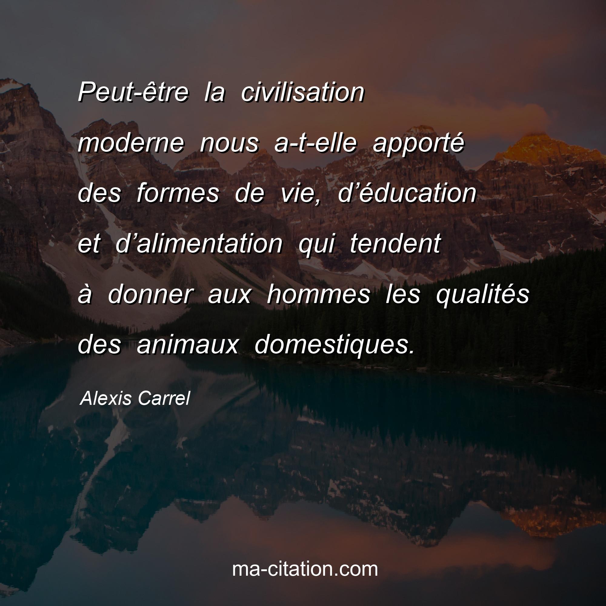 Citation sur la vie d'Alexis Carrel :Peut-être la civilisation moderne nous a-t-elle apporté des formes de vie, d’éducation et d’alimentation qui tendent à donner aux hommes les qualités des animaux domestiques.