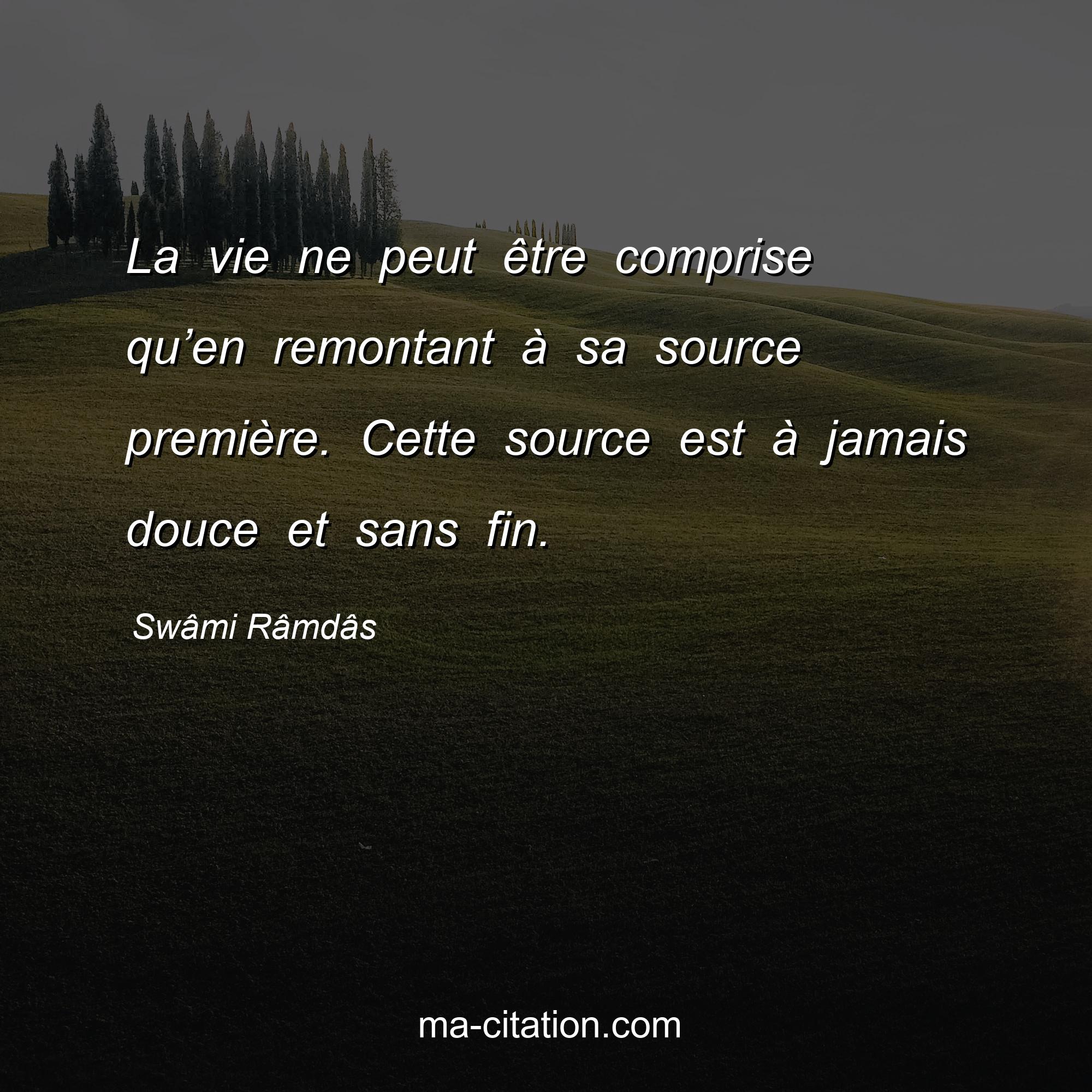 Swâmi Râmdâs est l'auteur de la citation sur la vie "La vie ne peut être comprise qu’en remontant à sa source première. Cette source est à jamais douce et sans fin.".
