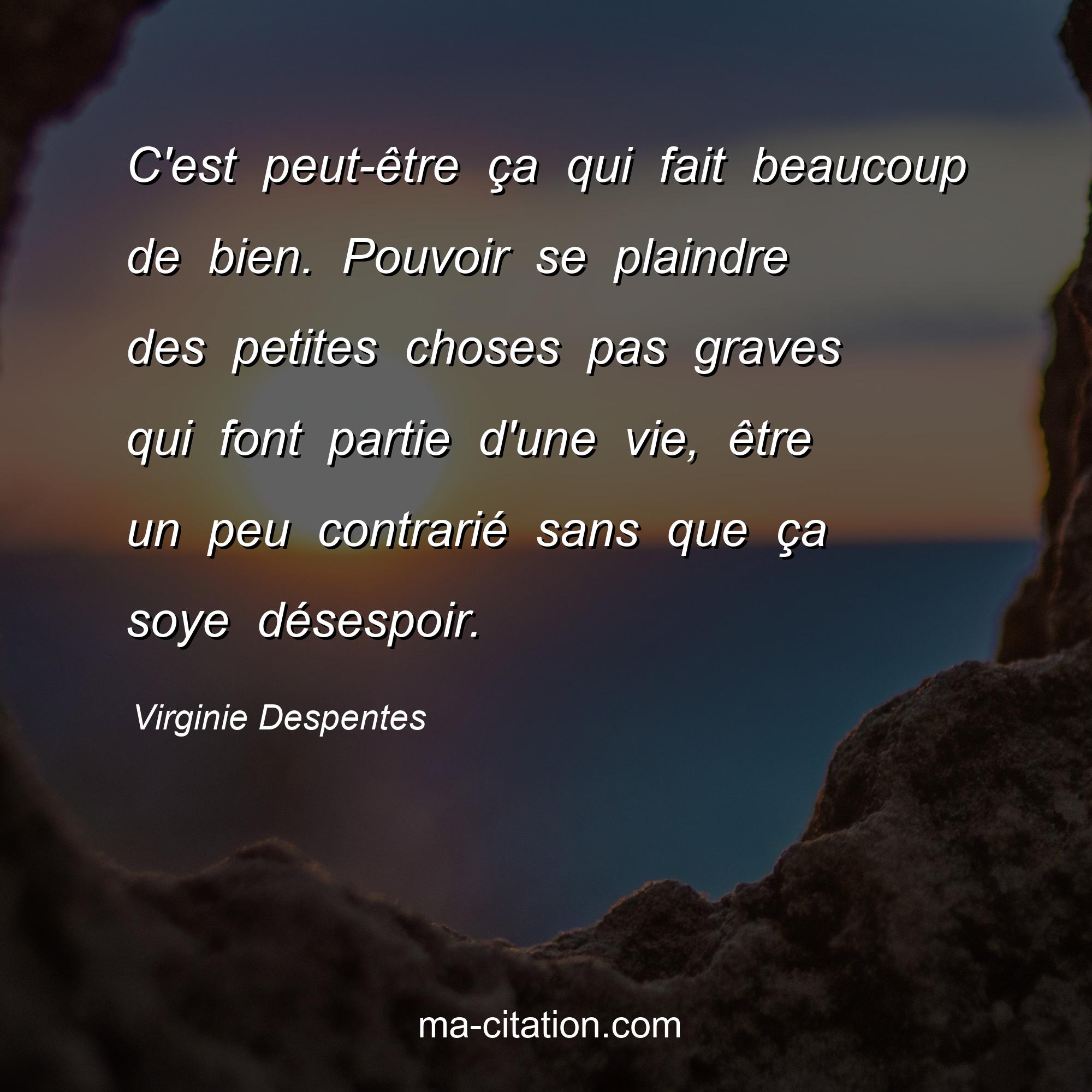 Citation sur la vie de Virginie Despentes :C'est peut-être ça qui fait beaucoup de bien. Pouvoir se plaindre des petites choses pas graves qui font partie d'une vie, être un peu contrarié sans que ça soye désespoir.