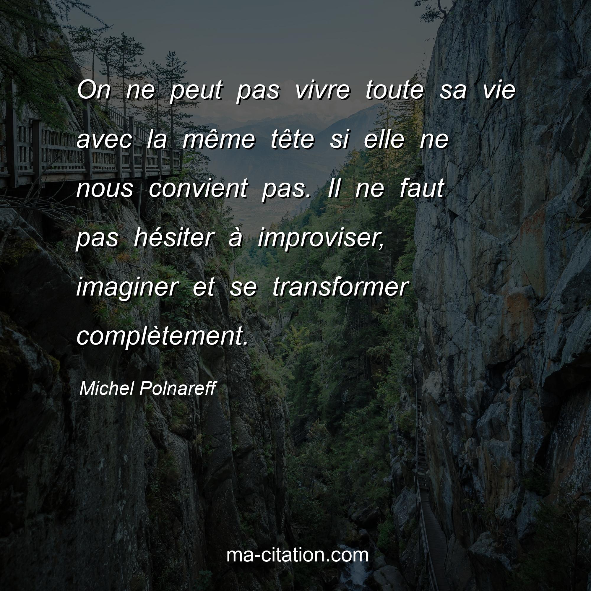 Citation sur la vie de Michel Polnareff :On ne peut pas vivre toute sa vie avec la même tête si elle ne nous convient pas. Il ne faut pas hésiter à improviser, imaginer et se transformer complètement.