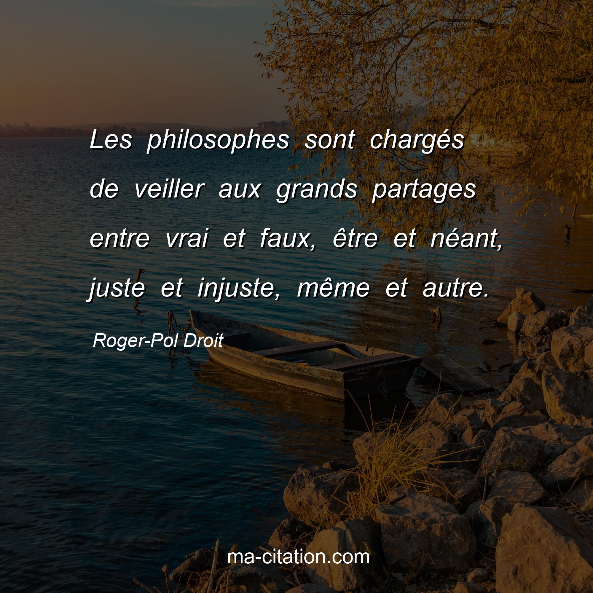 Citation sur la vie de Roger-Pol Droit :Les philosophes sont chargés de veiller aux grands partages entre vrai et faux, être et néant, juste et injuste, même et autre.