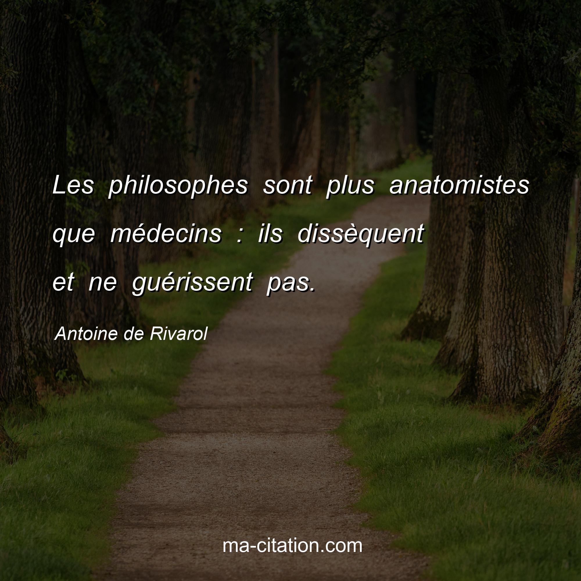 Citation sur la vie d'Antoine de Rivarol :Les philosophes sont plus anatomistes que médecins : ils dissèquent et ne guérissent pas.