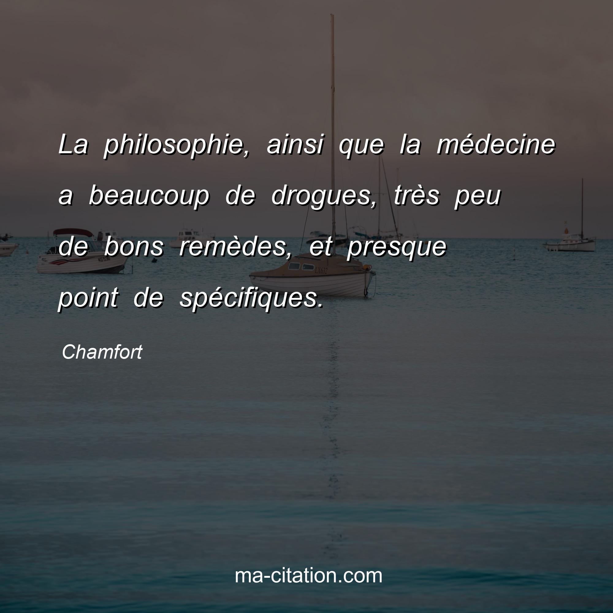 Citation sur la vie de Chamfort :La philosophie, ainsi que la médecine a beaucoup de drogues, très peu de bons remèdes, et presque point de spécifiques.