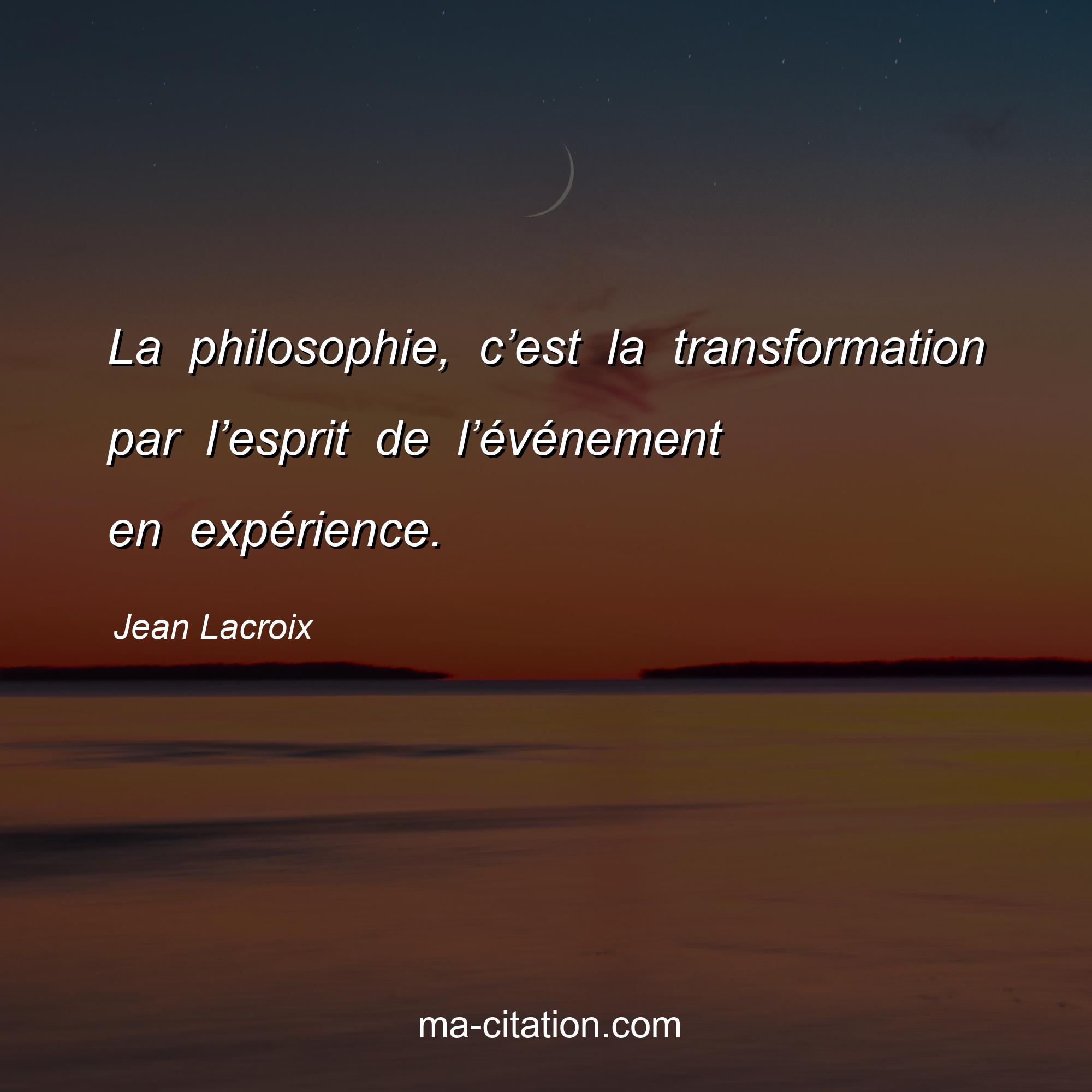Citation sur la vie de Jean Lacroix :La philosophie, c’est la transformation par l’esprit de l’événement en expérience.