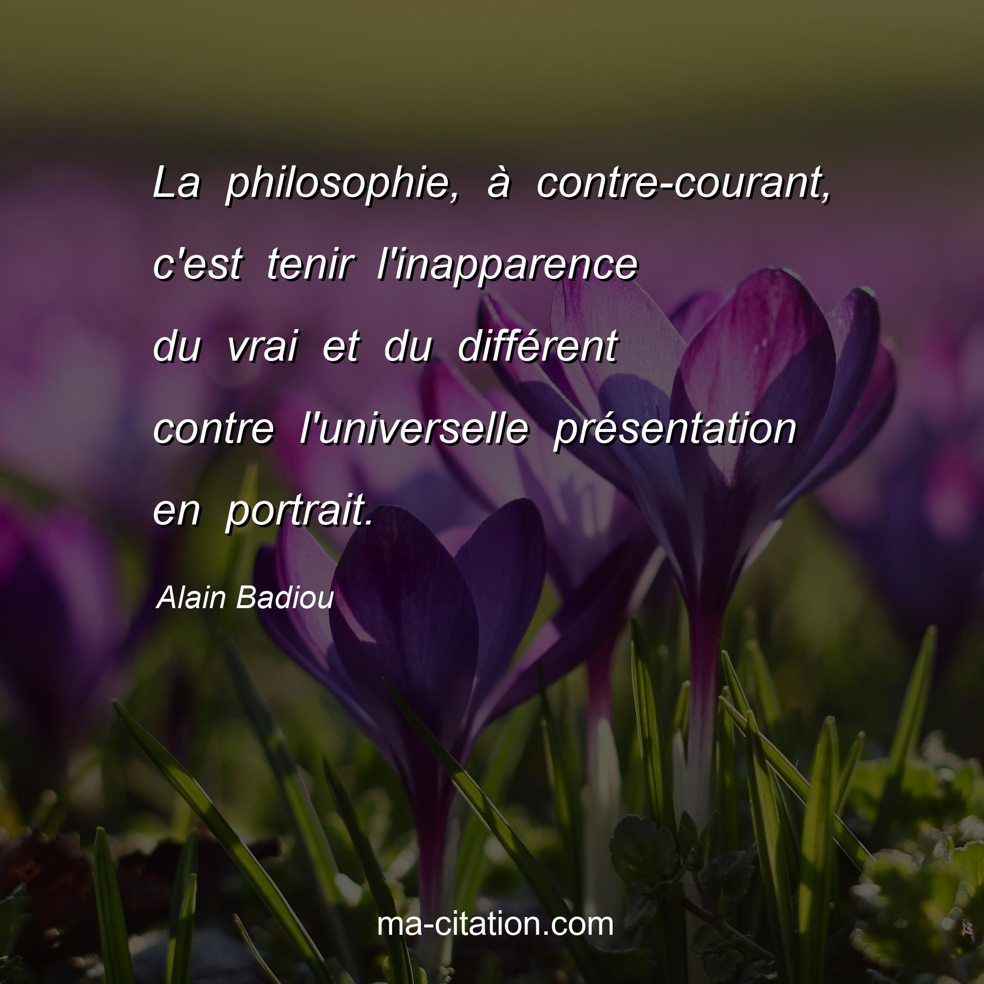 Citation sur la vie d'Alain Badiou :La philosophie, à contre-courant, c'est tenir l'inapparence du vrai et du différent contre l'universelle présentation en portrait.
