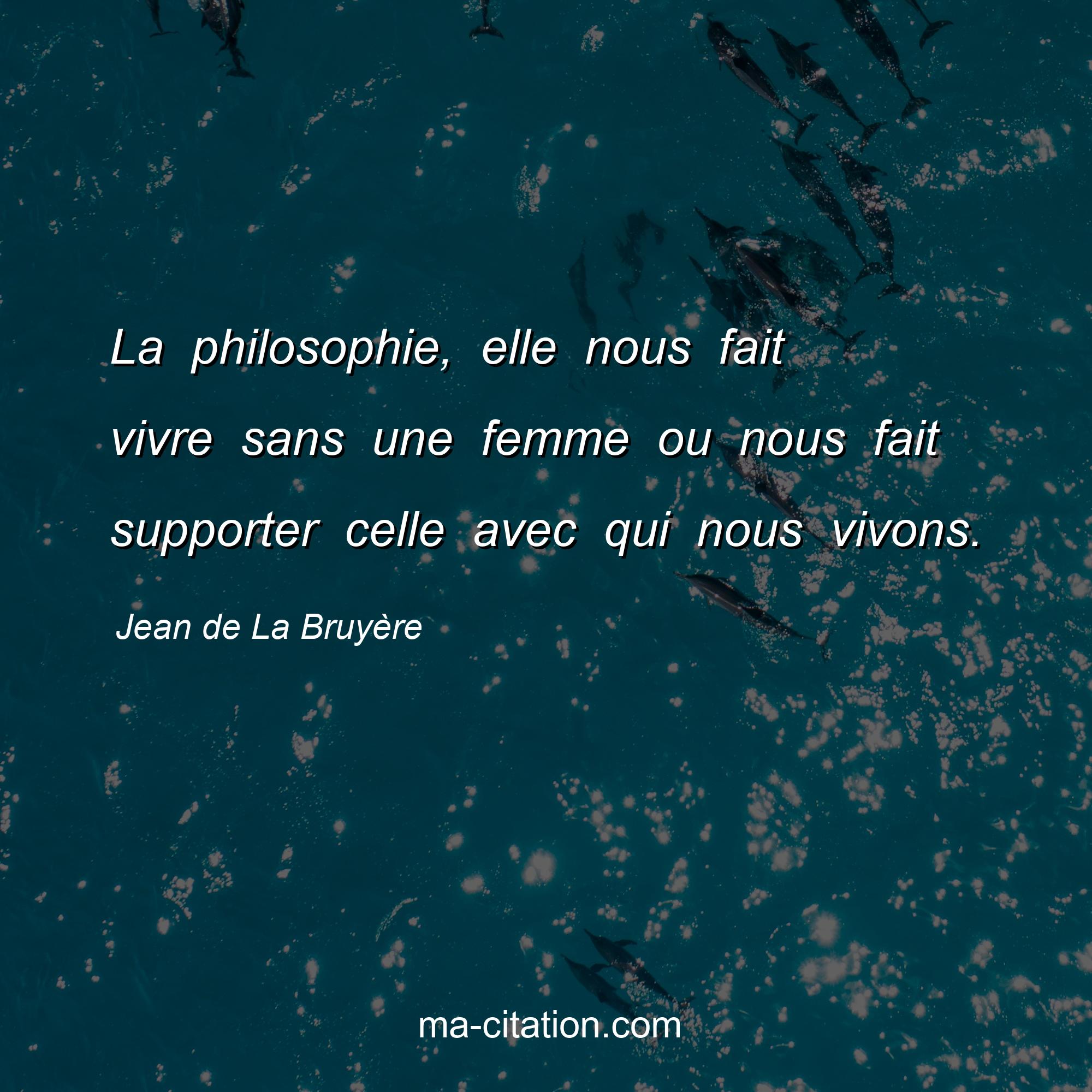 Citation sur la vie de Jean de La Bruyère :La philosophie, elle nous fait vivre sans une femme ou nous fait supporter celle avec qui nous vivons.
