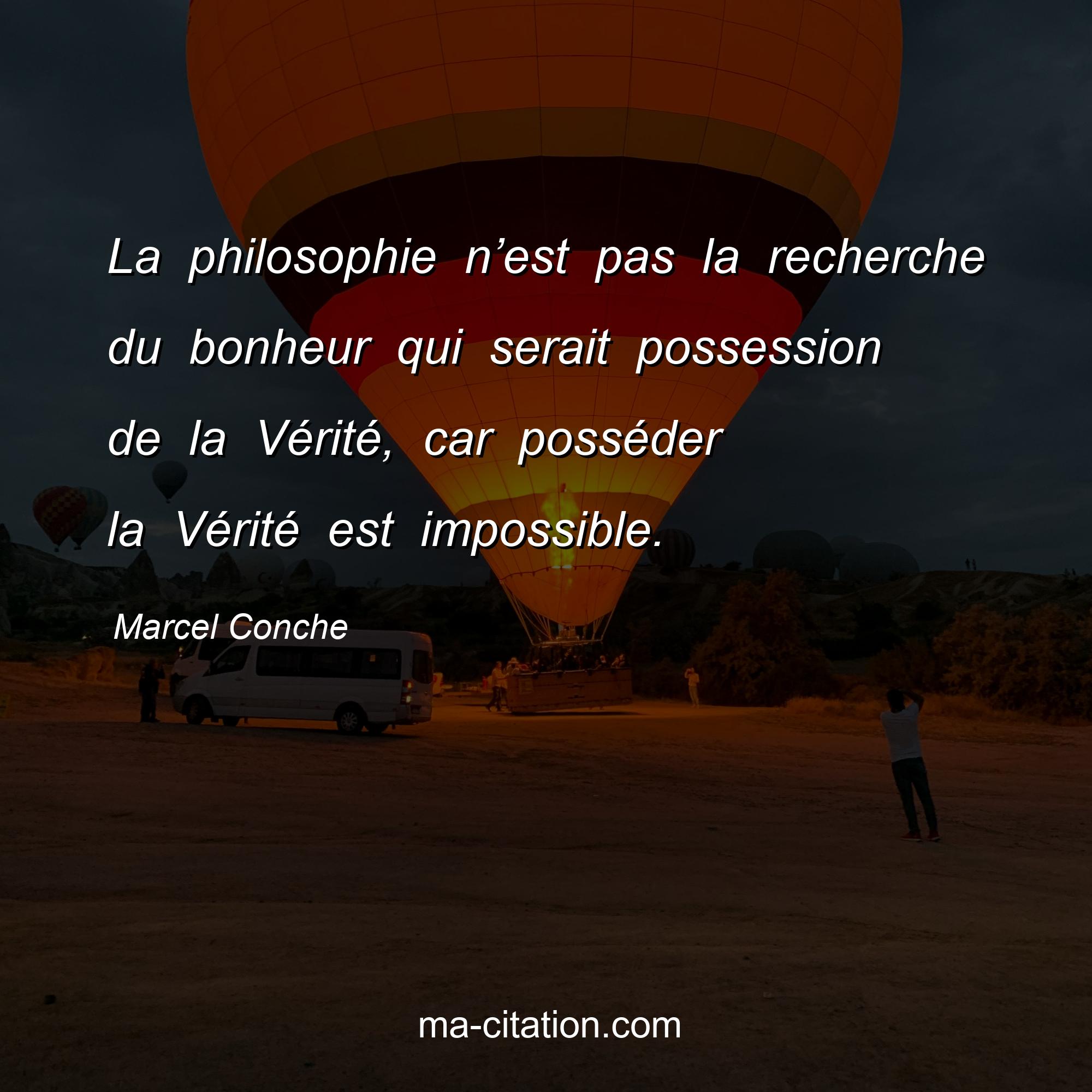Citation sur la vie de Marcel Conche :La philosophie n’est pas la recherche du bonheur qui serait possession de la Vérité, car posséder la Vérité est impossible.