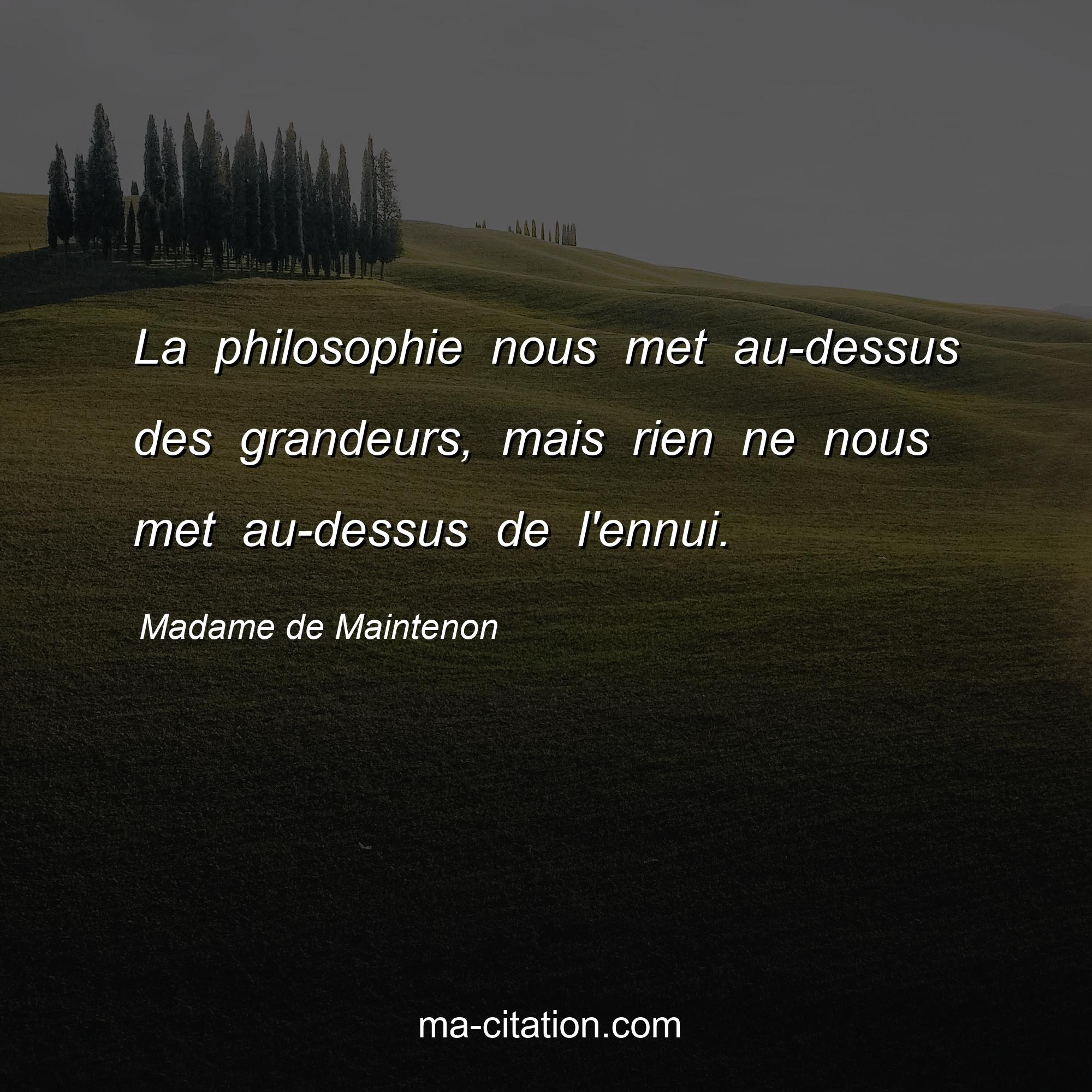 Madame de Maintenon est l'auteur de la citation sur la vie "La philosophie nous met au-dessus des grandeurs, mais rien ne nous met au-dessus de l'ennui.".