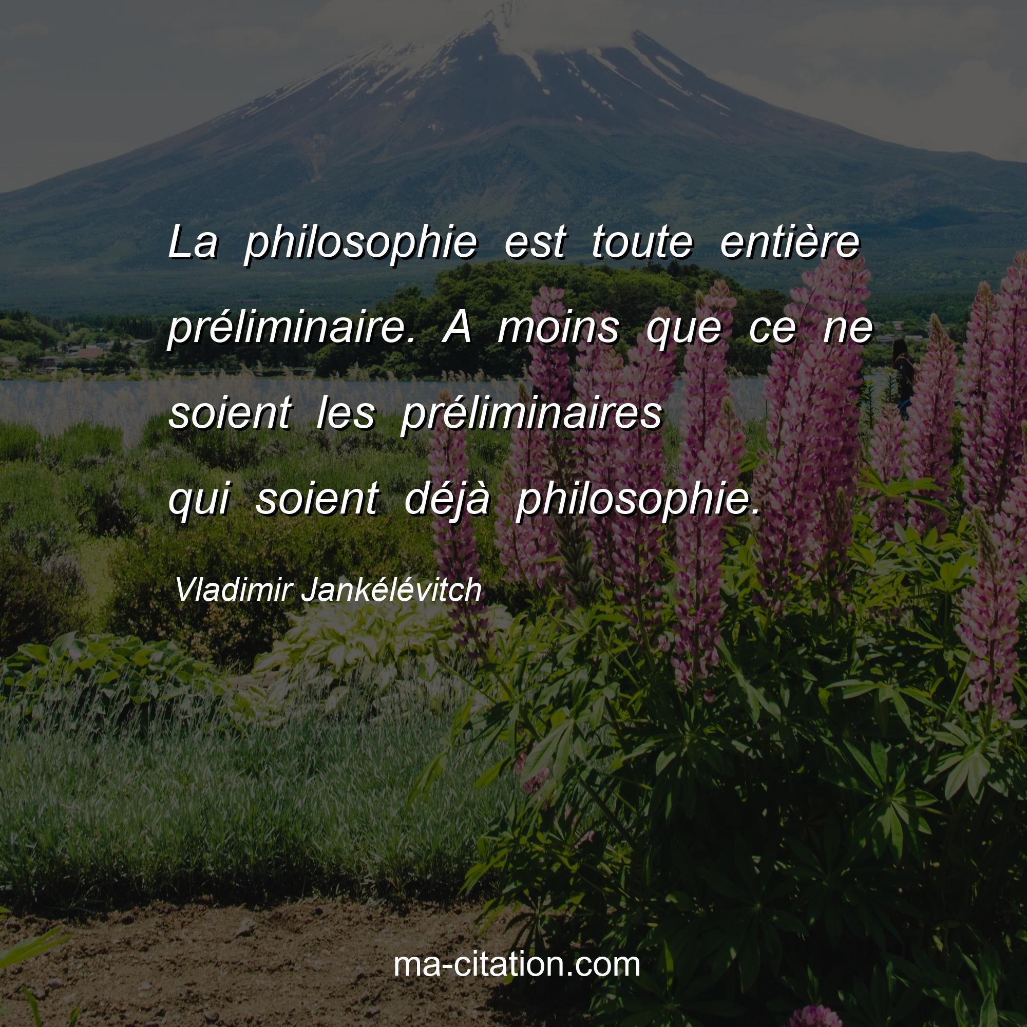 Citation sur la vie de Vladimir Jankélévitch :La philosophie est toute entière préliminaire. A moins que ce ne soient les préliminaires qui soient déjà philosophie.