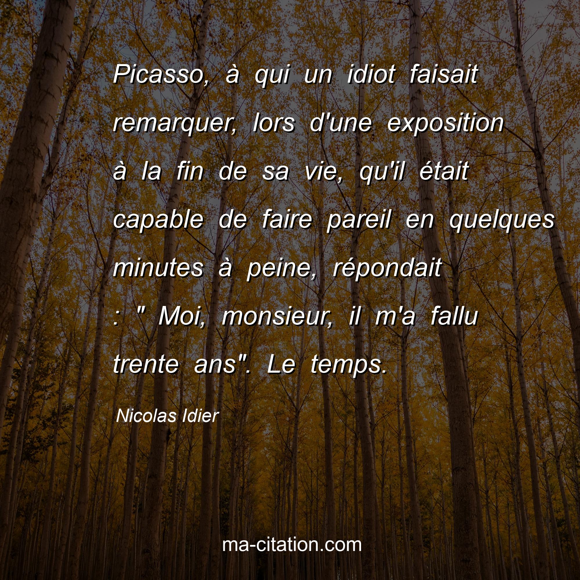 Citation sur la vie de Nicolas Idier :Picasso, à qui un idiot faisait remarquer, lors d'une exposition à la fin de sa vie, qu'il était capable de faire pareil en quelques minutes à peine, répondait : " Moi, monsieur, il m'a fallu trente ans". Le temps.