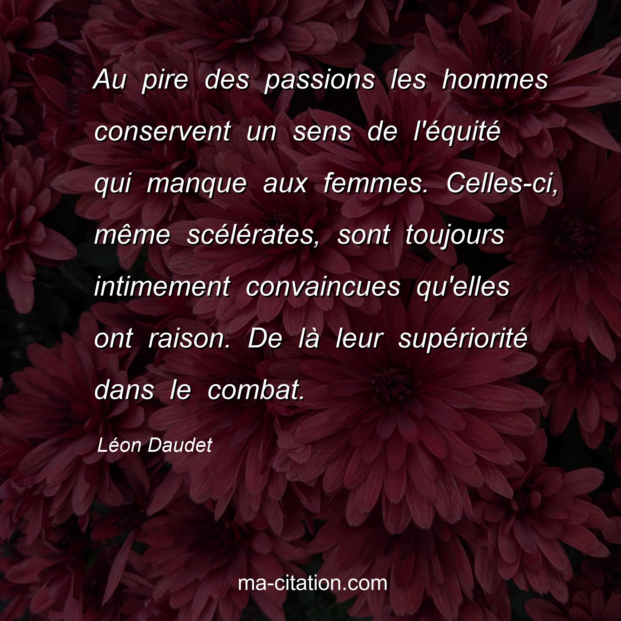 Citation sur la vie de Léon Daudet :Au pire des passions les hommes conservent un sens de l'équité qui manque aux femmes. Celles-ci, même scélérates, sont toujours intimement convaincues qu'elles ont raison. De là leur supériorité dans le combat.