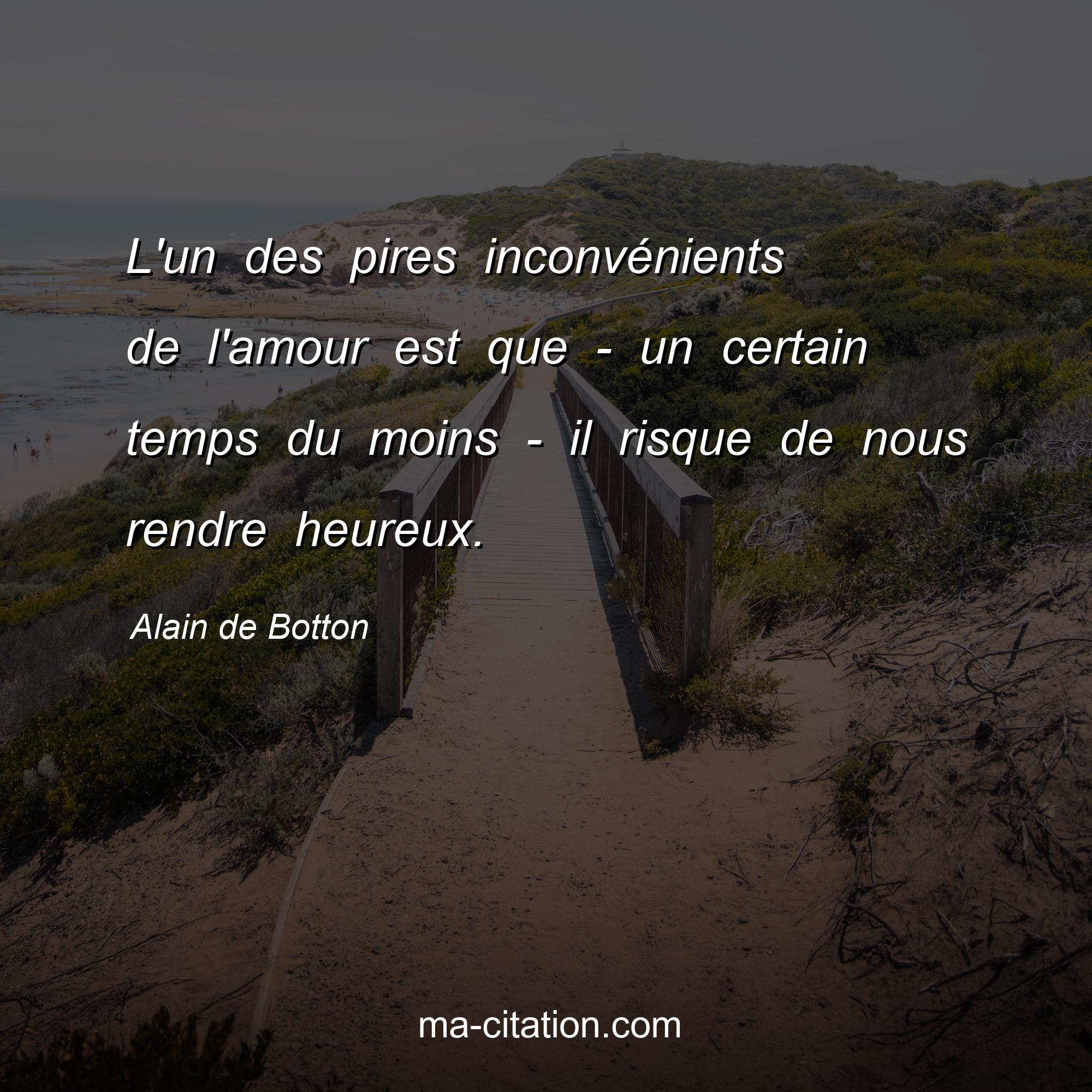 Citation sur la vie d'Alain de Botton :L'un des pires inconvénients de l'amour est que - un certain temps du moins - il risque de nous rendre heureux.