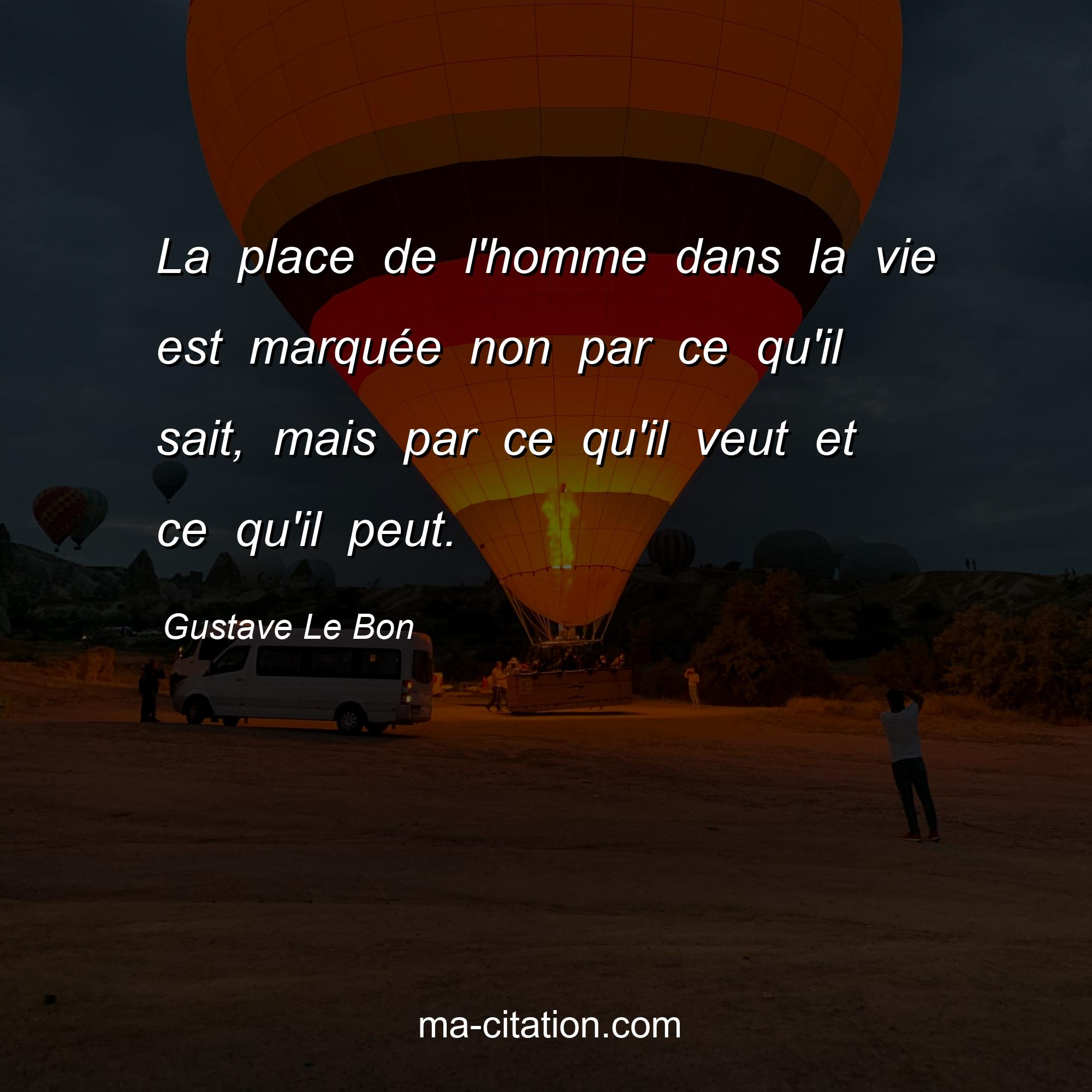 Gustave Le Bon est l'auteur de la citation sur la vie "La place de l'homme dans la vie est marquée non par ce qu'il sait, mais par ce qu'il veut et ce qu'il peut.".