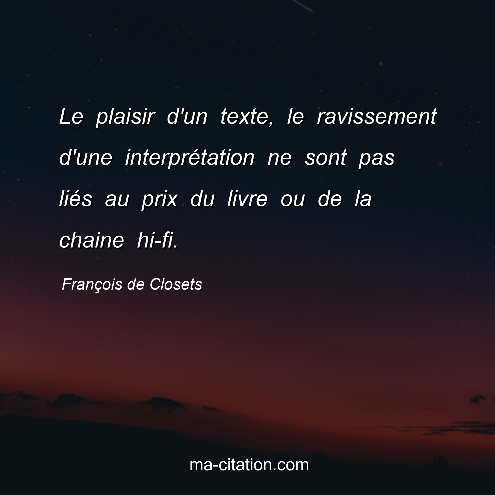 Citation sur la vie de François de Closets :Le plaisir d'un texte, le ravissement d'une interprétation ne sont pas liés au prix du livre ou de la chaine hi-fi.