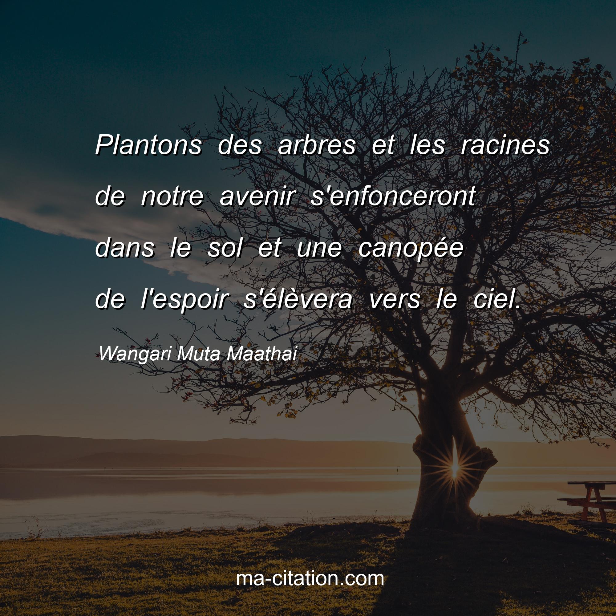Citation sur la vie de Wangari Muta Maathai :Plantons des arbres et les racines de notre avenir s'enfonceront dans le sol et une canopée de l'espoir s'élèvera vers le ciel.
