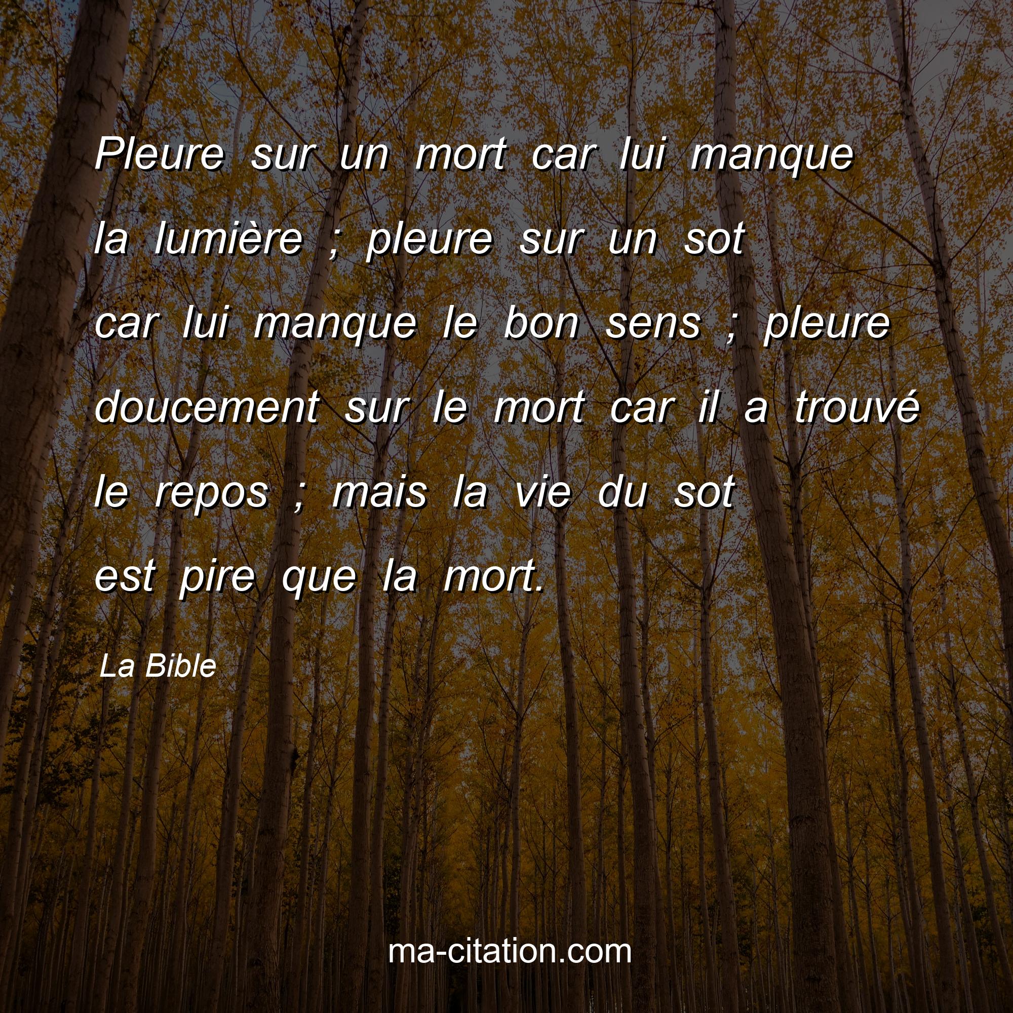 Citation sur la vie de La Bible :Pleure sur un mort car lui manque la lumière ; pleure sur un sot car lui manque le bon sens ; pleure doucement sur le mort car il a trouvé le repos ; mais la vie du sot est pire que la mort.