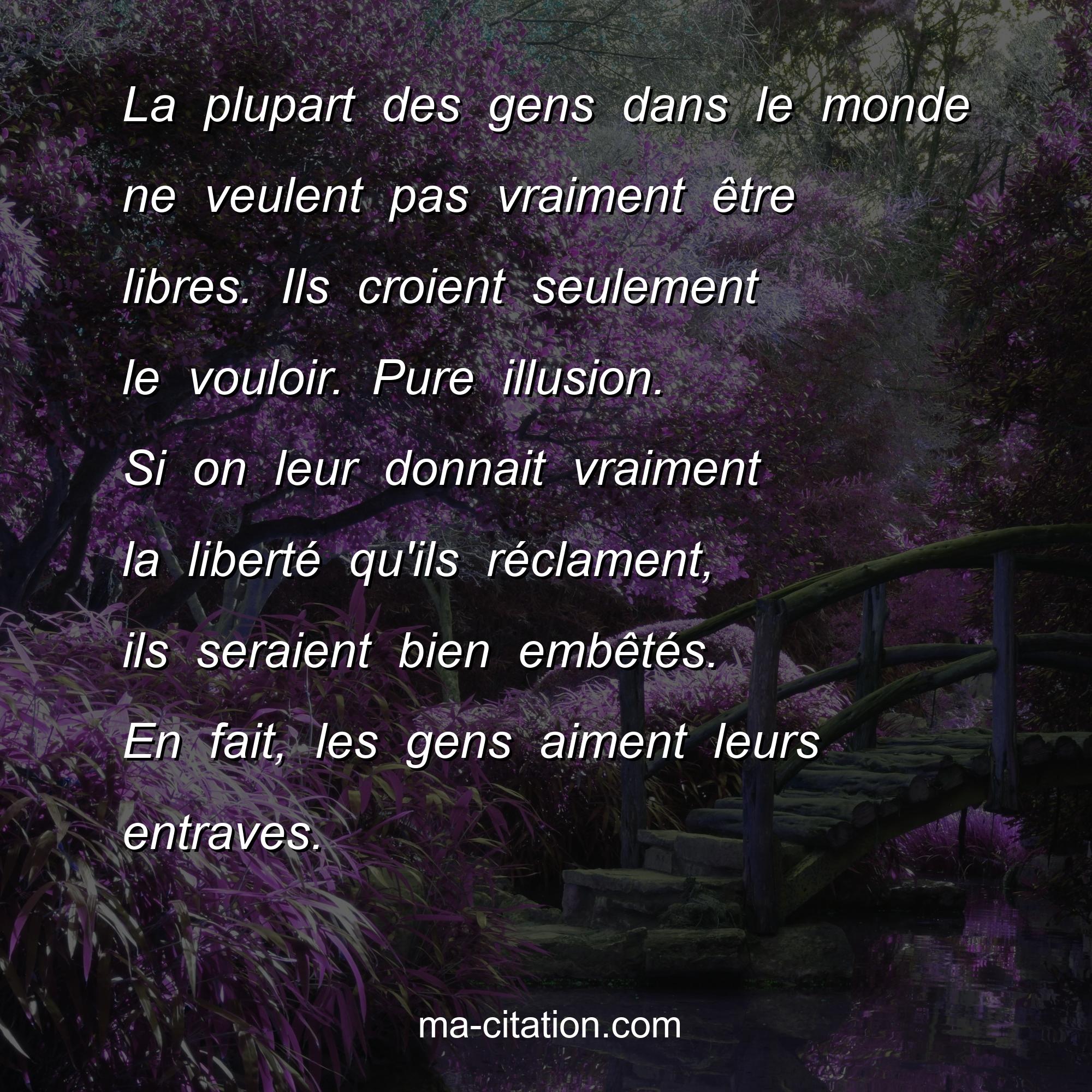 La plupart des gens dans le monde ne veulent pas vraiment être libres. Ils croient seulement le vouloir. Pure illusion. Si on leur donnait vraiment la liberté qu'ils réclament, ils seraient bien embêtés. En fait, les gens aiment leurs entraves.