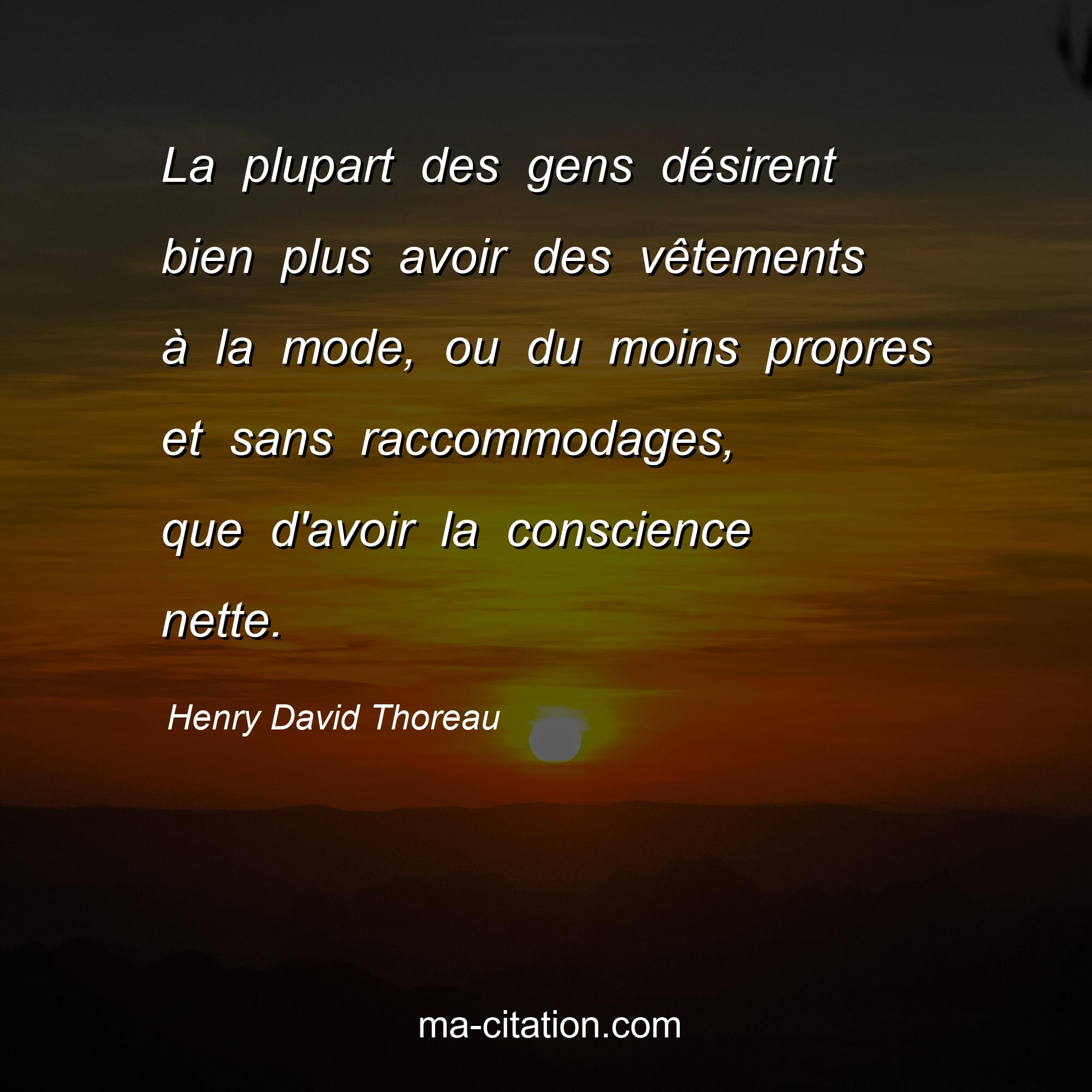 Citation sur la vie de Henry David Thoreau :La plupart des gens désirent bien plus avoir des vêtements à la mode, ou du moins propres et sans raccommodages, que d'avoir la conscience nette.