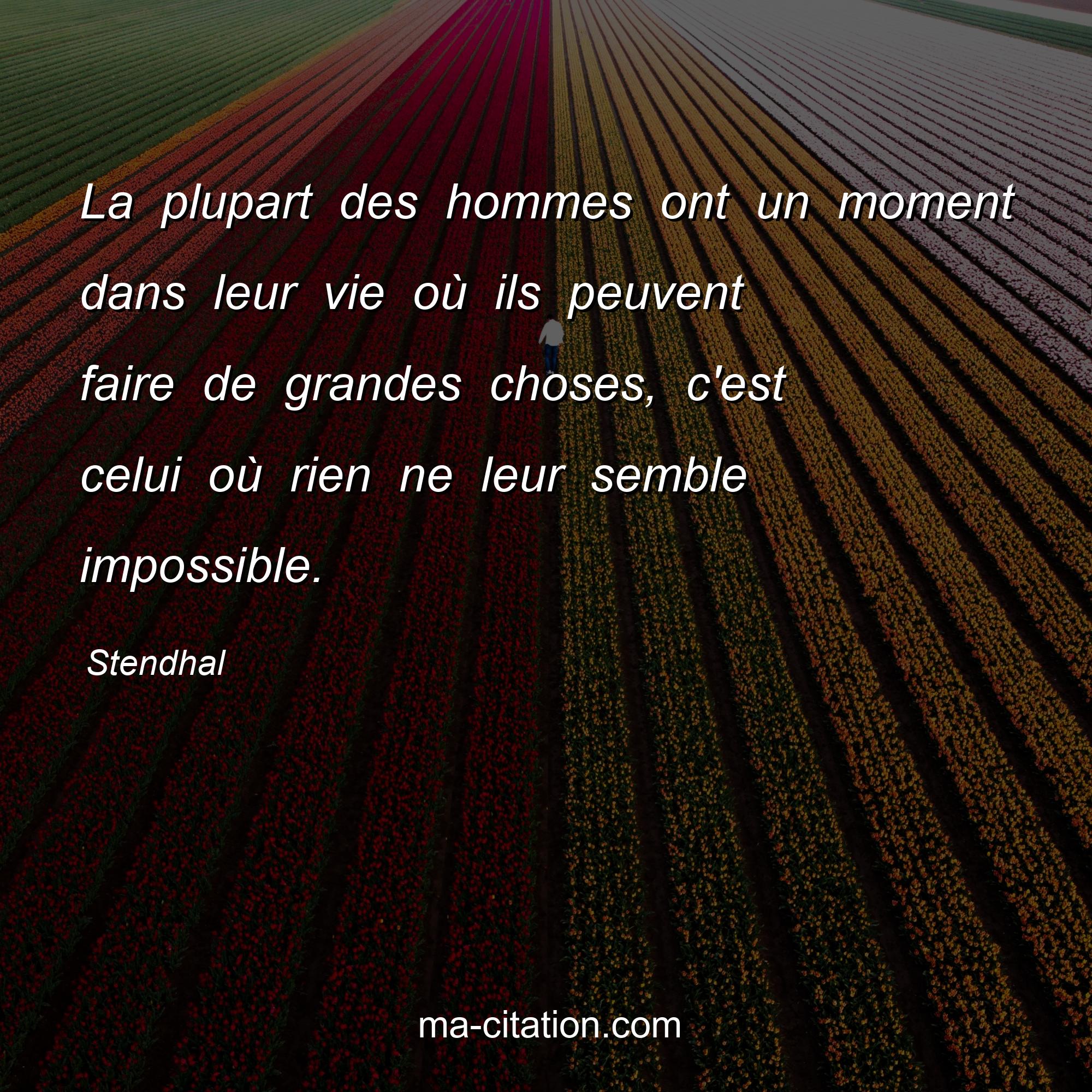 Citation sur la vie de Stendhal :La plupart des hommes ont un moment dans leur vie où ils peuvent faire de grandes choses, c'est celui où rien ne leur semble impossible.