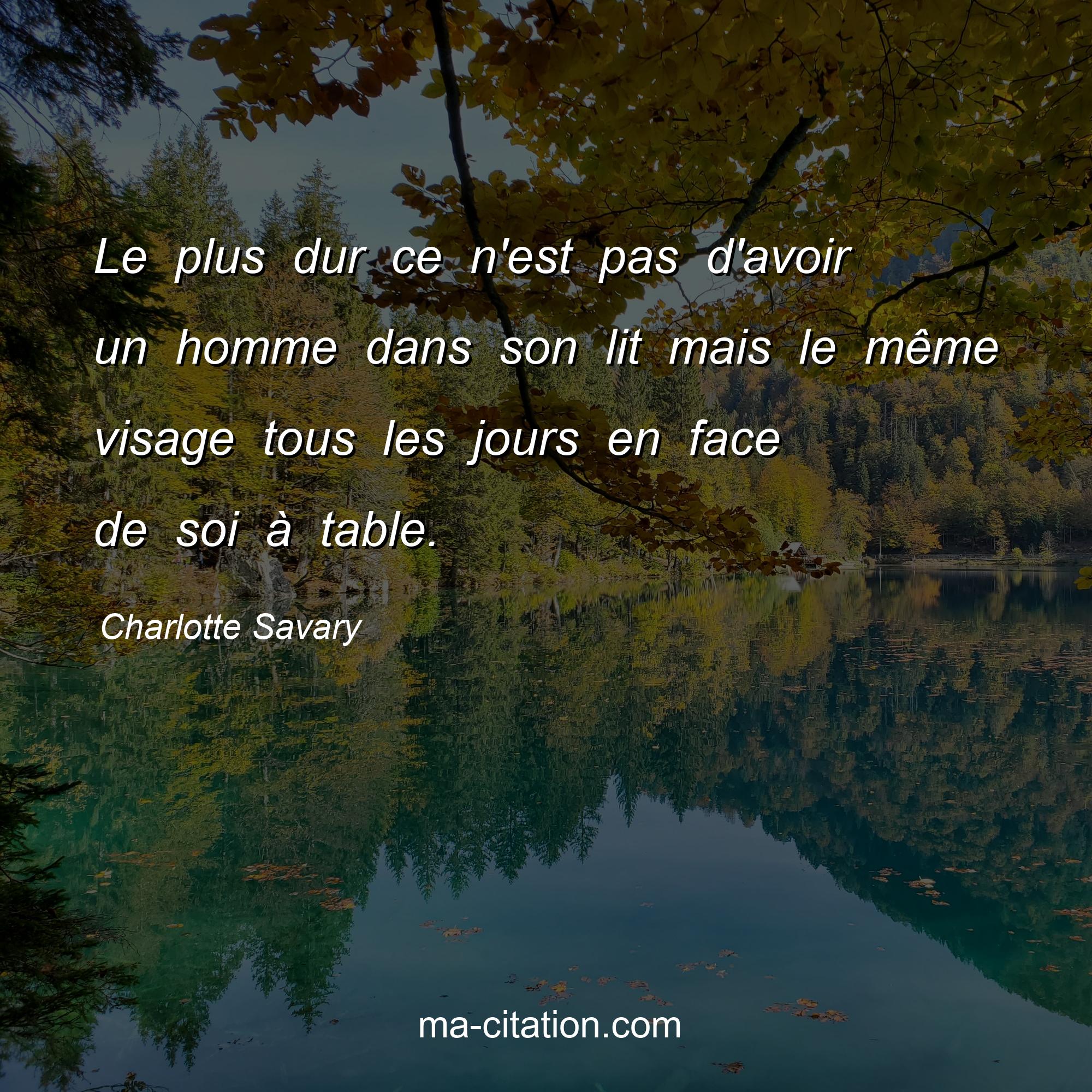 Charlotte Savary est l'auteur de la citation sur la vie "Le plus dur ce n'est pas d'avoir un homme dans son lit mais le même visage tous les jours en face de soi à table.".