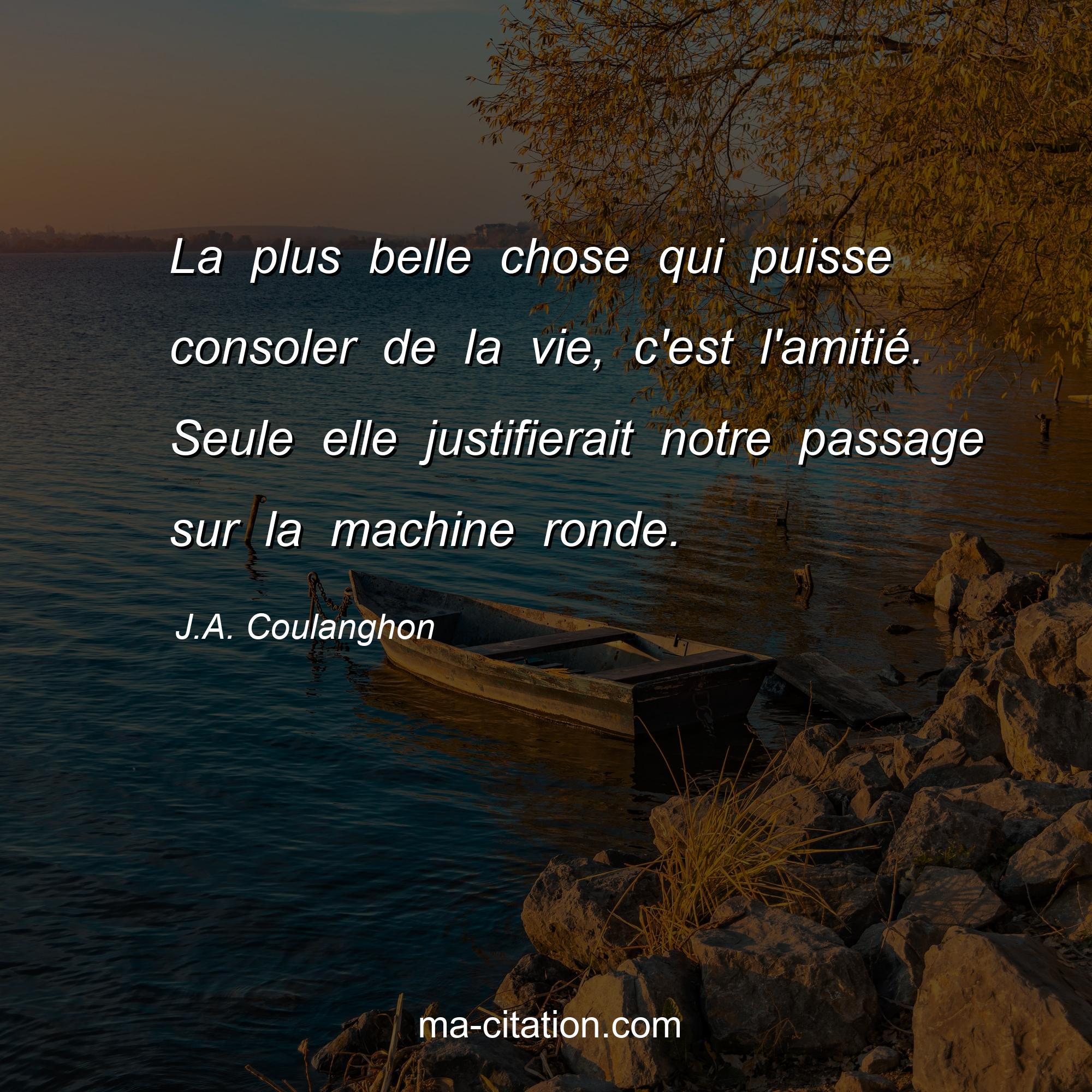 J.A. Coulanghon est l'auteur de la citation sur la vie "La plus belle chose qui puisse consoler de la vie, c'est l'amitié. Seule elle justifierait notre passage sur la machine ronde.".