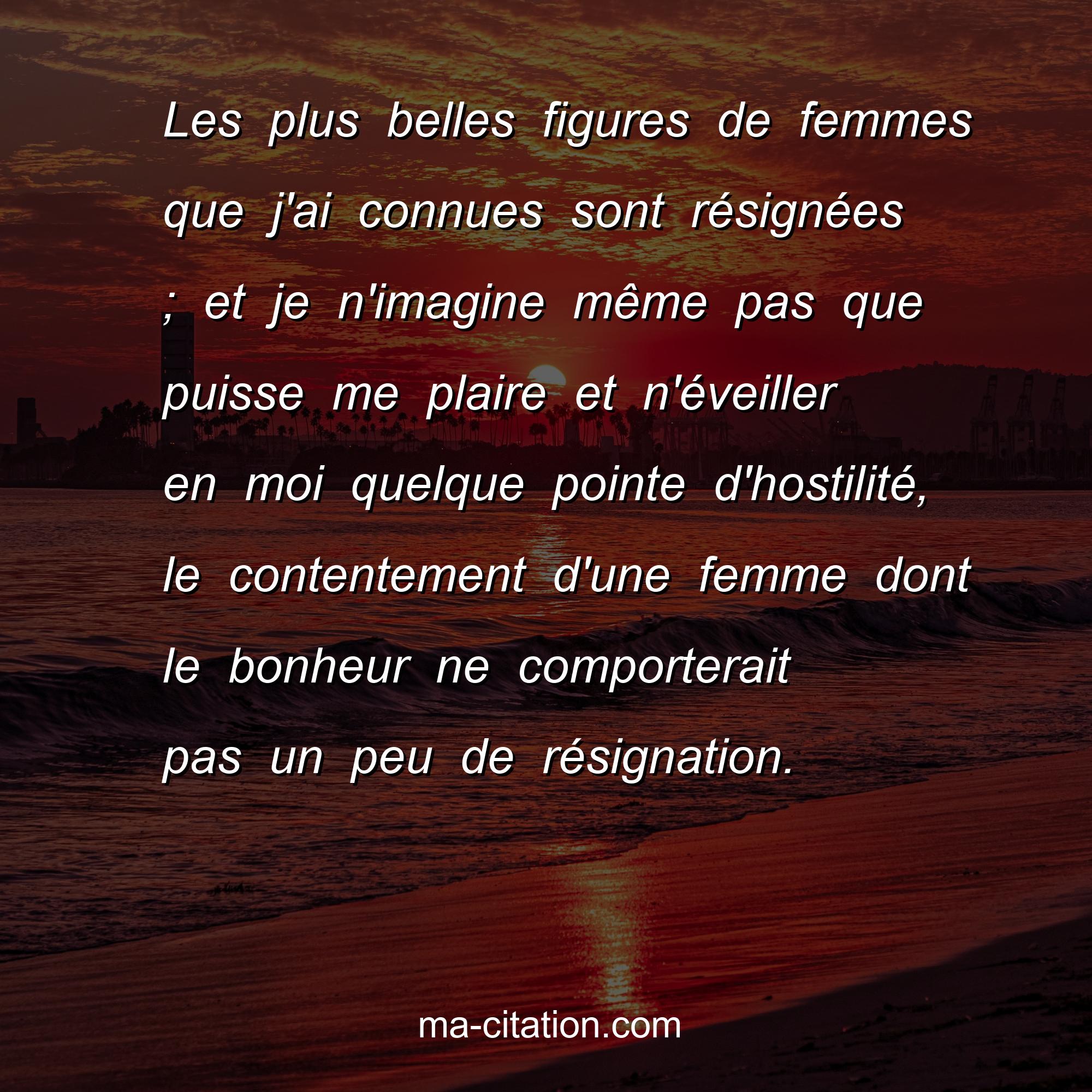 Les plus belles figures de femmes que j'ai connues sont résignées ; et je n'imagine même pas que puisse me plaire et n'éveiller en moi quelque pointe d'hostilité, le contentement d'une femme dont le bonheur ne comporterait pas un peu de résignation.