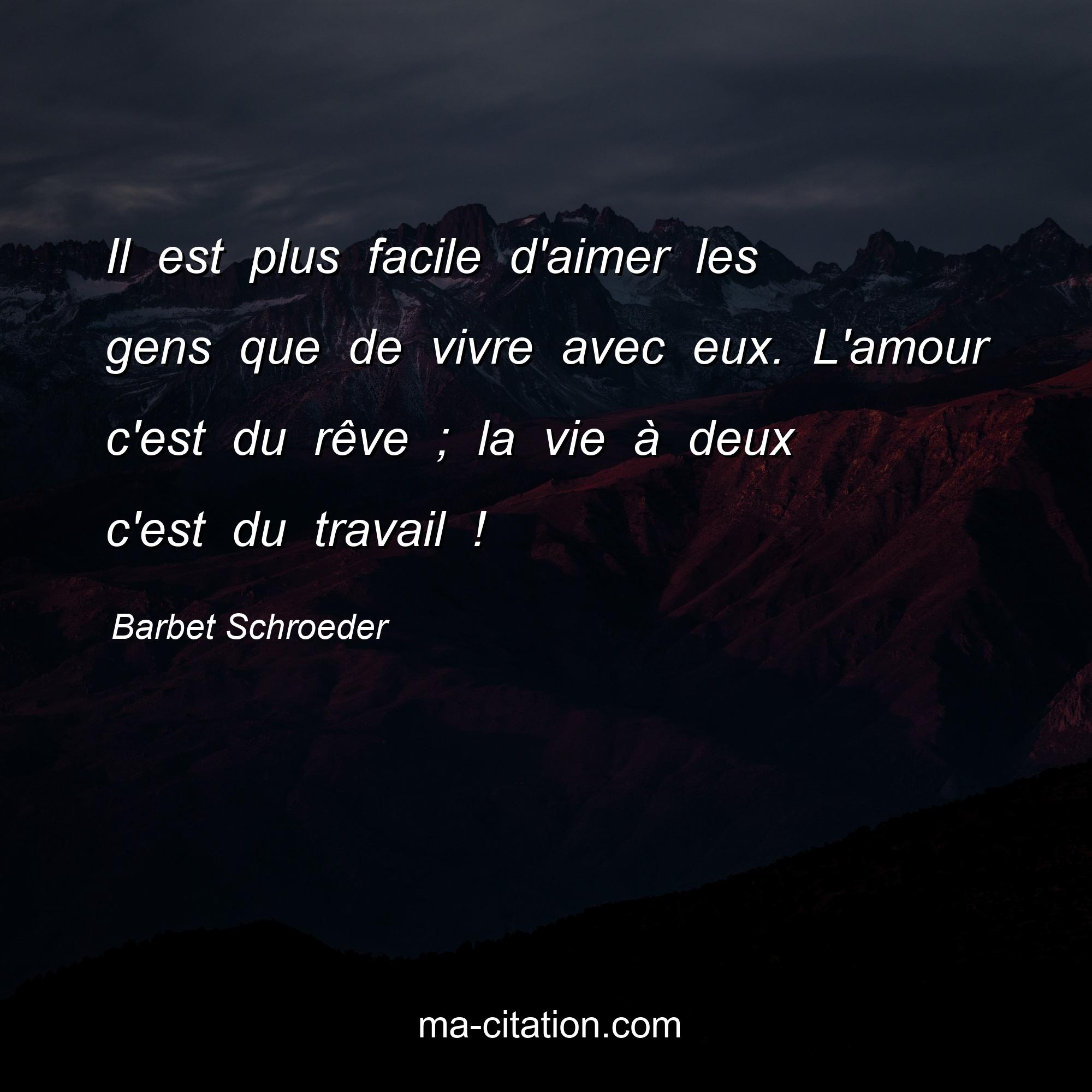 Barbet Schroeder est l'auteur de la citation sur la vie "Il est plus facile d'aimer les gens que de vivre avec eux. L'amour c'est du rêve ; la vie à deux c'est du travail !".