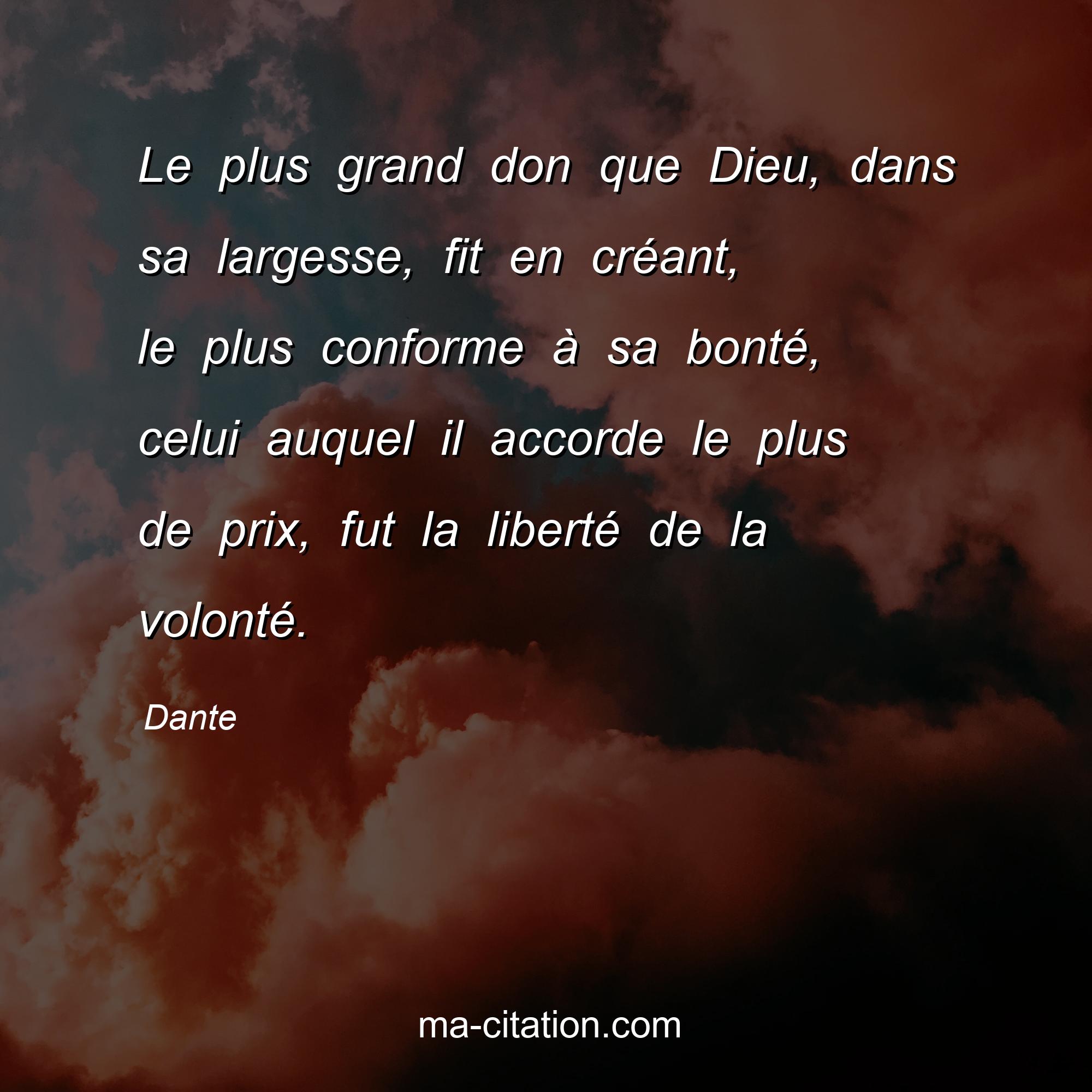 Citation sur la vie de Dante :Le plus grand don que Dieu, dans sa largesse, fit en créant, le plus conforme à sa bonté, celui auquel il accorde le plus de prix, fut la liberté de la volonté.