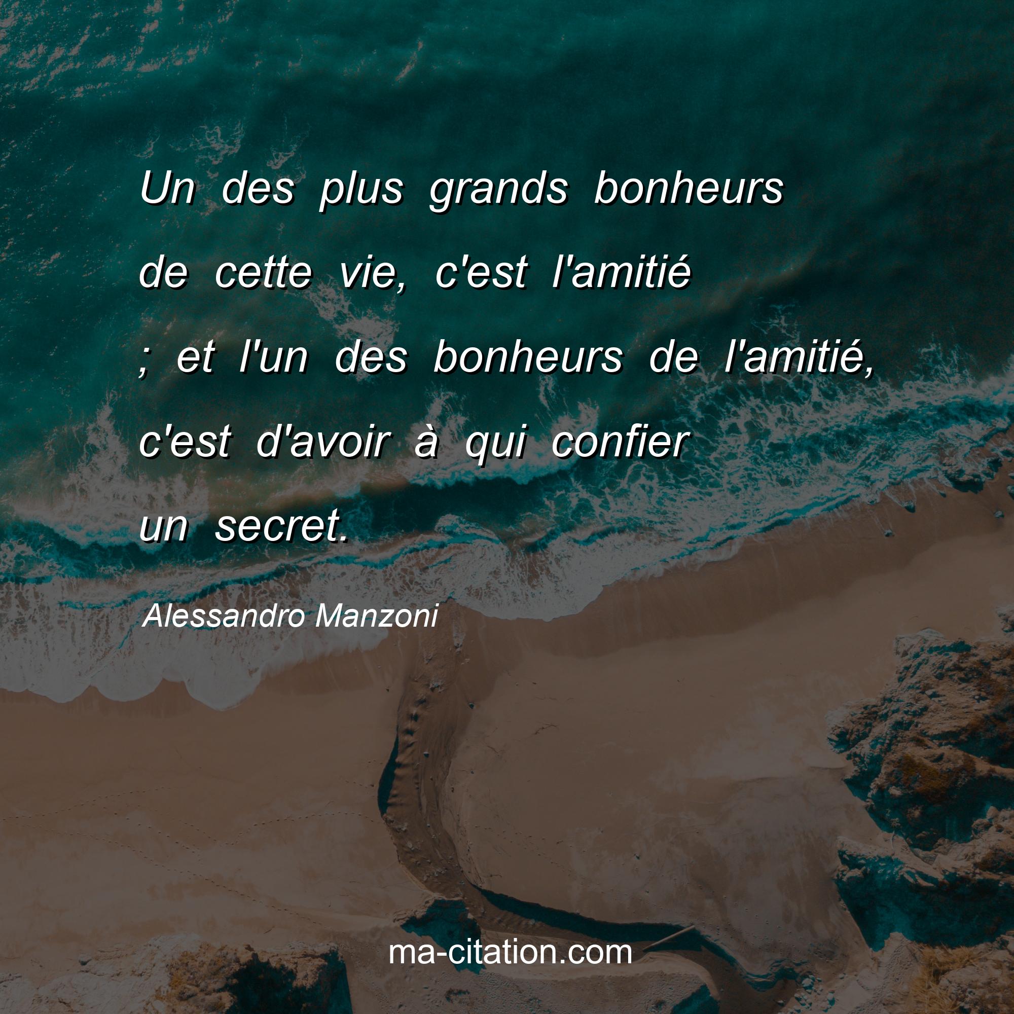 Citation sur la vie d'Alessandro Manzoni :Un des plus grands bonheurs de cette vie, c'est l'amitié ; et l'un des bonheurs de l'amitié, c'est d'avoir à qui confier un secret.
