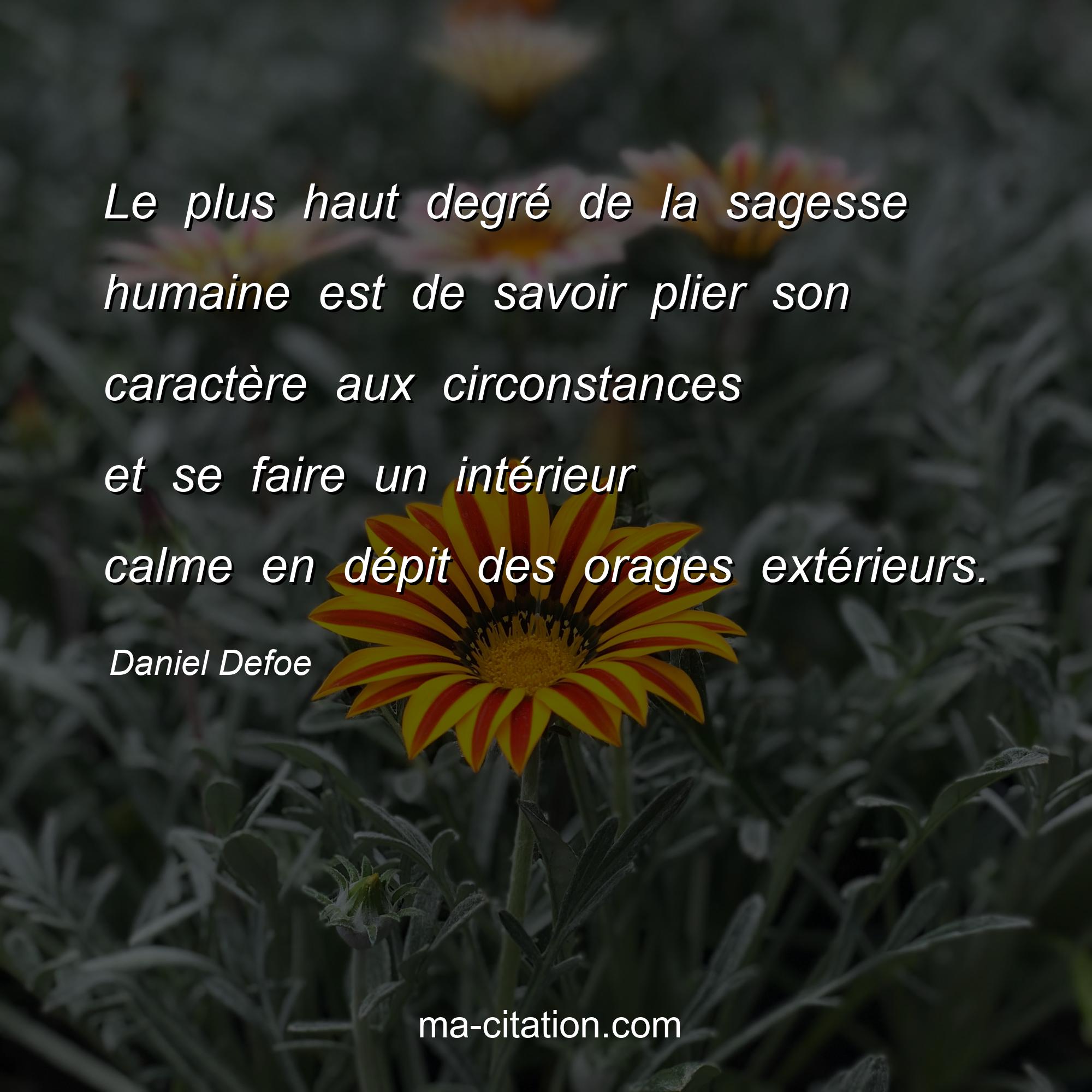 Citation sur la vie de Daniel Defoe :Le plus haut degré de la sagesse humaine est de savoir plier son caractère aux circonstances et se faire un intérieur calme en dépit des orages extérieurs.