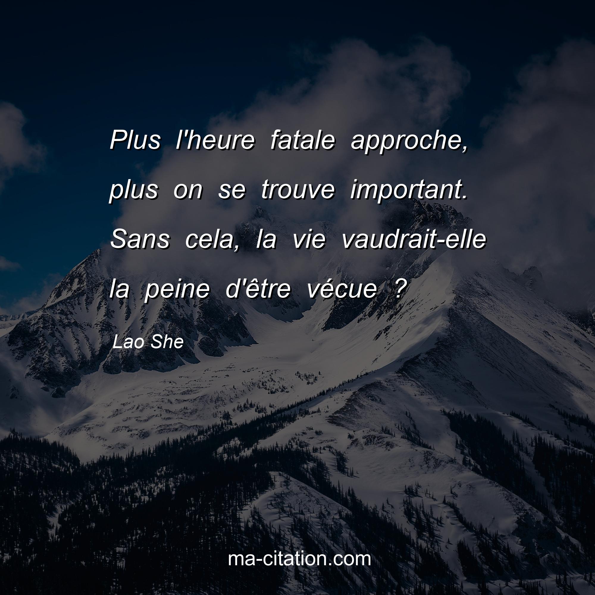 Lao She est l'auteur de la citation sur la vie "Plus l'heure fatale approche, plus on se trouve important. Sans cela, la vie vaudrait-elle la peine d'être vécue ?".