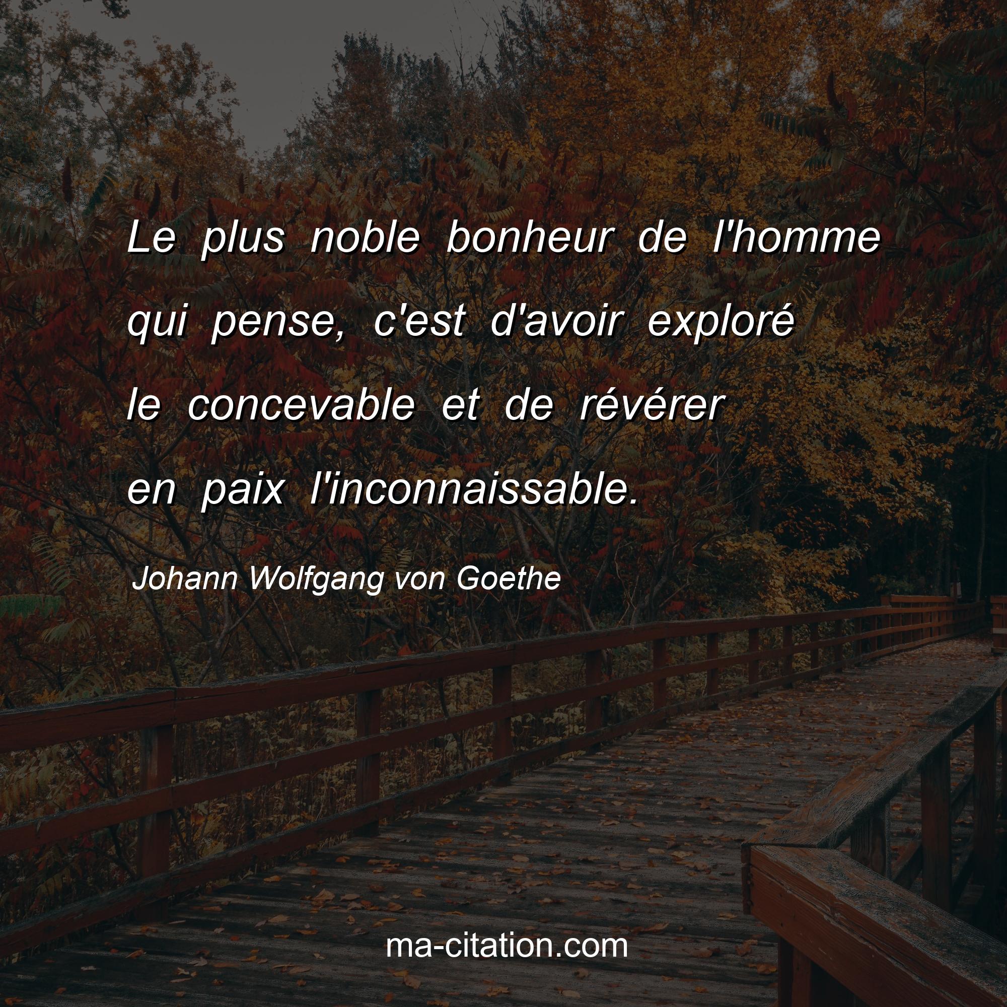 Citation sur la vie de Johann Wolfgang von Goethe :Le plus noble bonheur de l'homme qui pense, c'est d'avoir exploré le concevable et de révérer en paix l'inconnaissable.