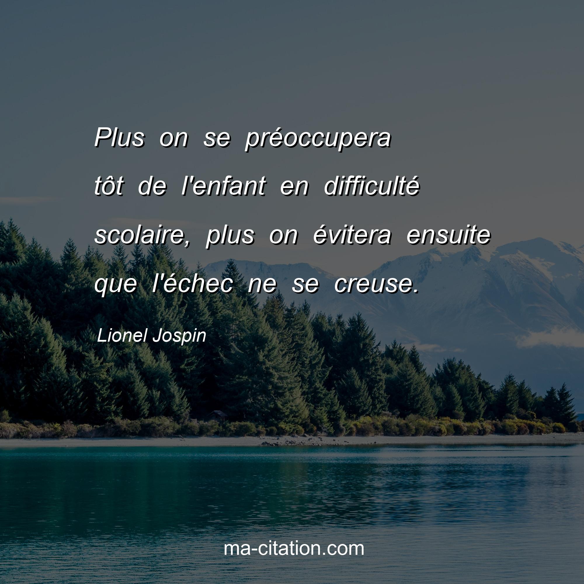 Citation sur la vie de Lionel Jospin :Plus on se préoccupera tôt de l'enfant en difficulté scolaire, plus on évitera ensuite que l'échec ne se creuse.